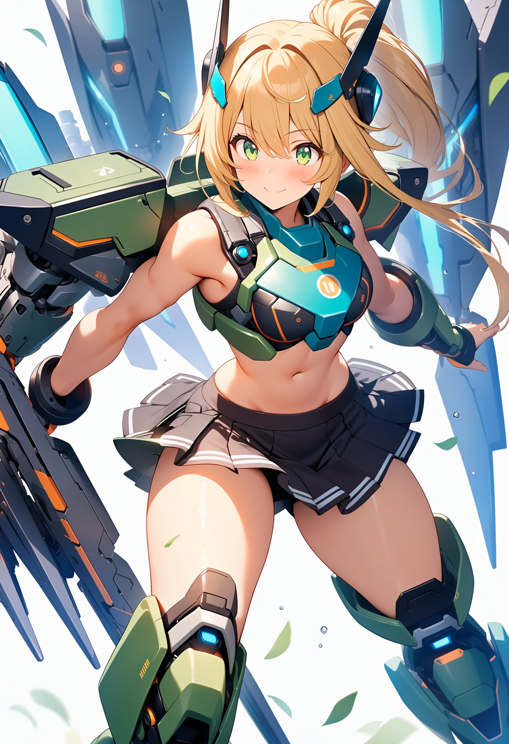 1girl, ((white background)), ultra detailed 8k cg render, masterpiece, high resolution, extremely detailed, mecha musume,mecha shoulder, mech leg, headgear, mecha armor, ((mini skirt)),long blonde hair, dropping green eyes, smile, dynamic posing,