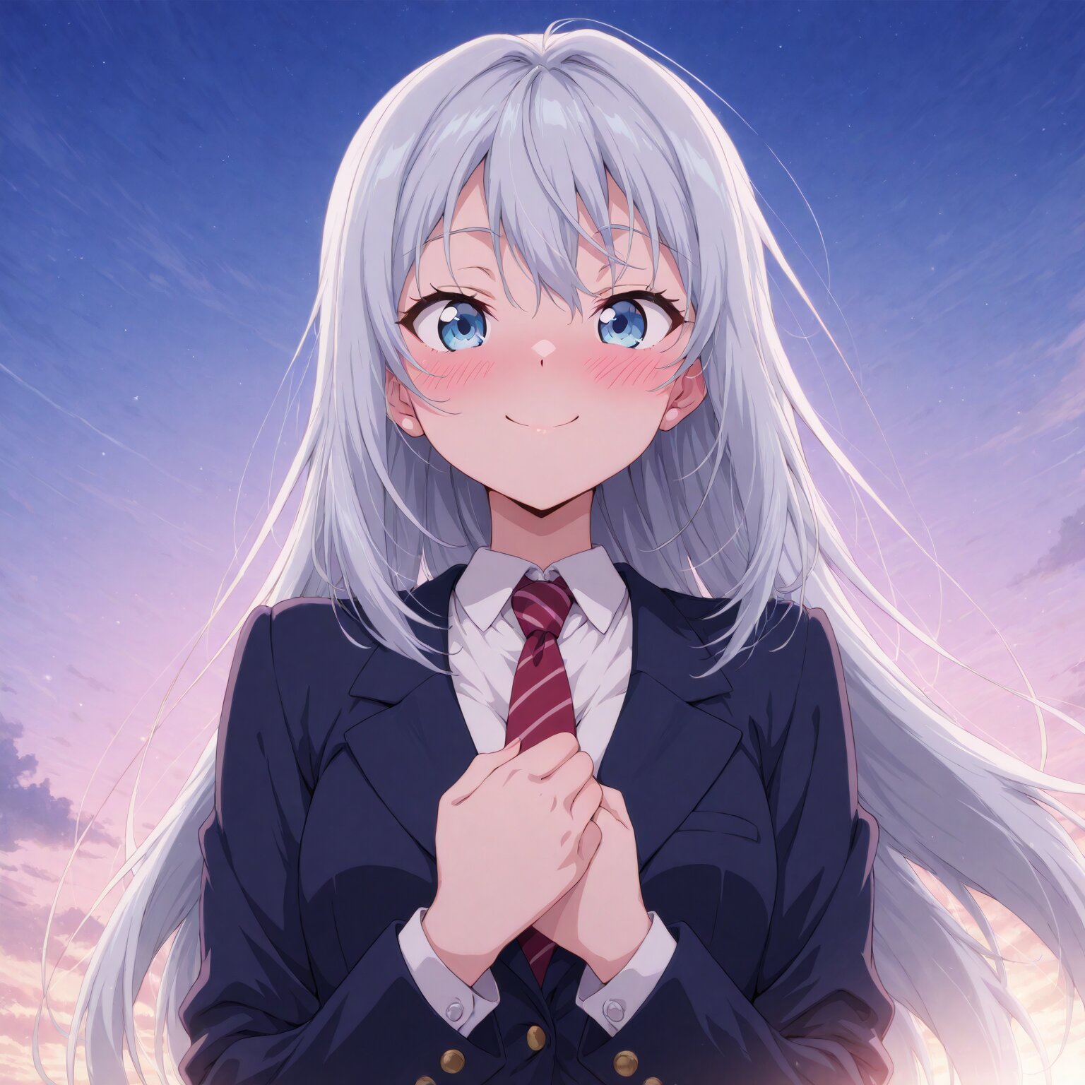 (1girl) light blue eyes, silver long hair Hair blowing in the wind Blazer jacket, dress shirt, tie Hands on chest, smiling, blushing BREAK, ((newest, anime, animation, anime screen capture, anime style:1.3)) BREAK, ((masterpiece, , vibrant, very aesthetic, highly detailed, best quality, 16k:1.3)) perfect fingers,
