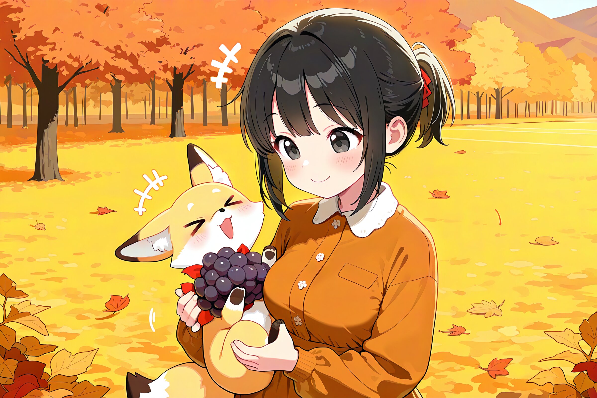 1 little girl, solo, masterpiece, best quality, amazing quality, very aesthetic, cute face and eyes, medium breasts, black hair, clear black eyes, short ponytail hair, cute and lovely, Vigorous, lively, and spontaneous personality, smile, cheerful, +++, notice lines, autumn outfit, little yellow fox, > <, holding grapes, autumn, mountains,