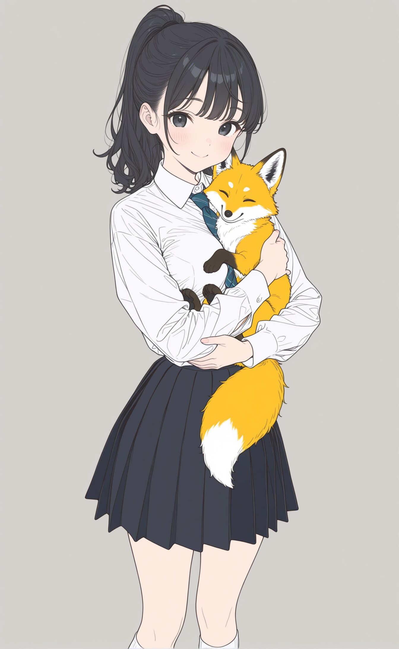 (flat color:1.5),4K,sense of depth,best quality,high resolution,masterpiece,ultra-detaied,(ideal body proportions),a pretty girl,solo,black hair,black eyes,(beutiful eyes),medium hair,haigh ponytail,smile,medium breast,white dress shirts,tie,black Pleated skirt,white socks,(hugging child Fox:1.5),(Fox is smiling;1.2)