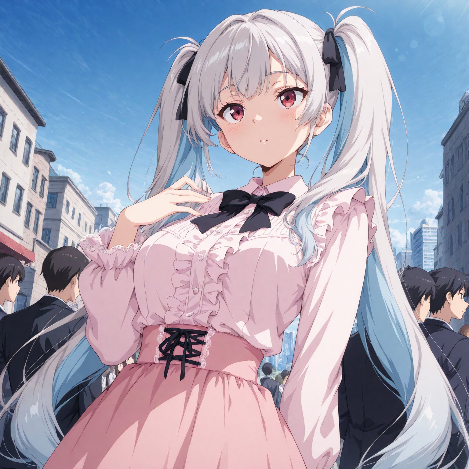 (1girl) twintails, very long twintails, waist-length straight twin-tails, Silver hair, pastel blue gradient hair, Pastel blue inner hair, silver and pastel-blue two-tone hair, natural soft flow, no curls, no drills, red eyes, gentle expression, elegant and cute atmosphere, mature feminine body shape, healthy curves, slim waist, clean skin, refined beauty Pink dress shirt, ruffles, Gothic Lolita, Lolita clothing, skirt, lace, City, winter city, downtown, crowd Tilts head, looks up at the sky BREAK, ((newest, anime, animation, anime screen capture, anime style:1.3)) BREAK, ((masterpiece, , vibrant, very aesthetic, highly detailed, best quality, 16k:1.3)) perfect fingers,