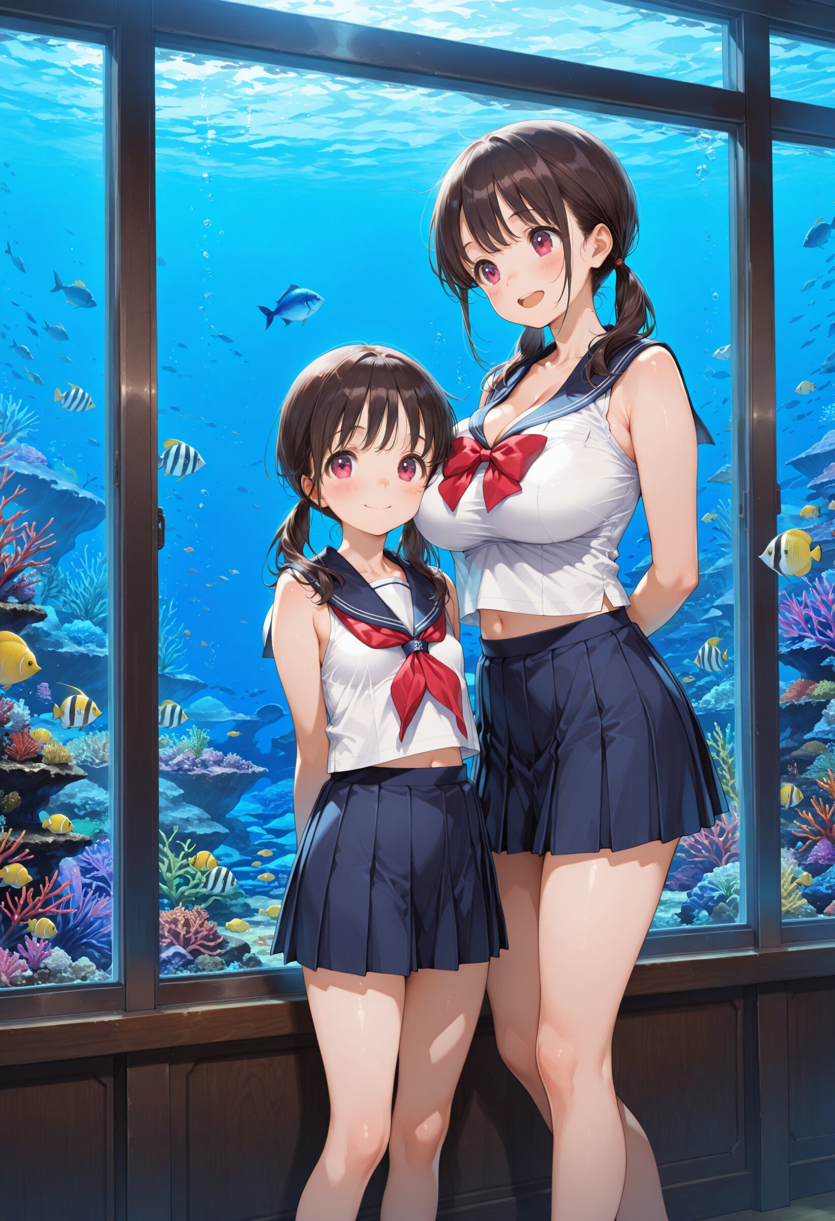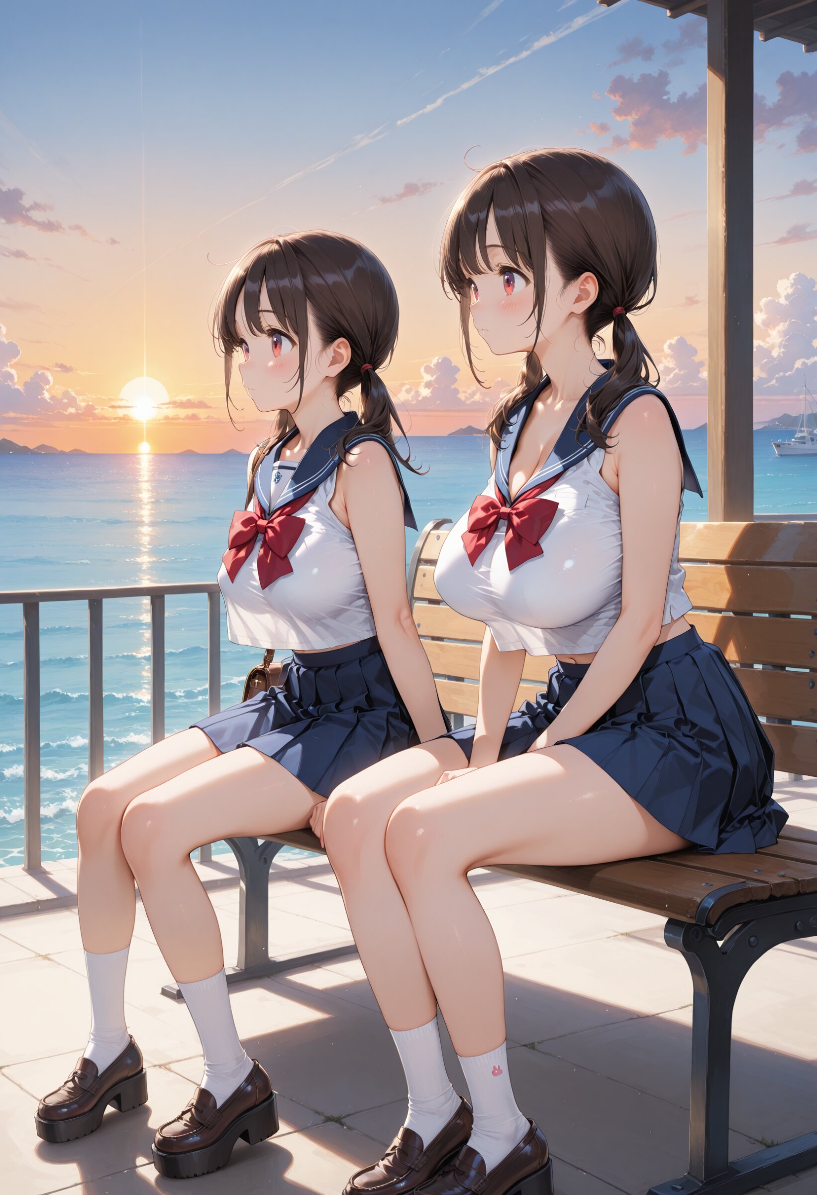 masterpiece, best quality, amazing quality, general, fine detail, official art, 2girls, loli, low twintails, school sailor uniform, sleeveless, miniskirt, midriff peek, cleavage between sailor collar, beautiful legs, big breasts, impossible clothes, perky breasts, ocean view, platform, sitting on bench, sunset, from side, look at ocean,