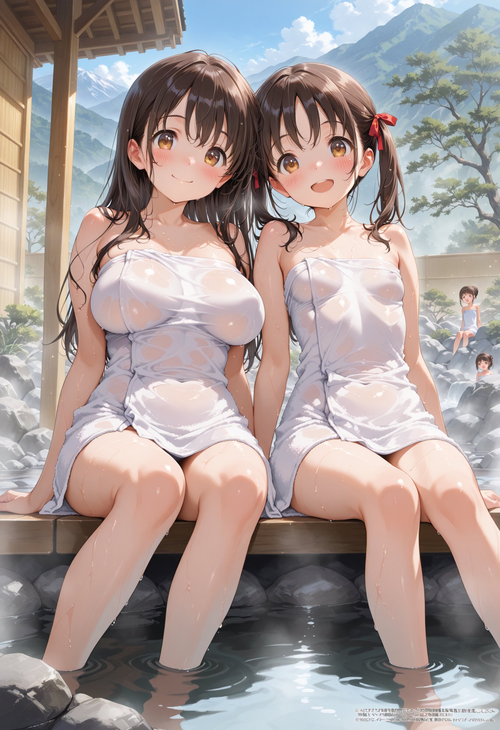 masterpiece, best quality, amazing quality, general, fine detail, official art, 2girls, loli, beautiful legs, big breasts, impossible clothes, perky breasts, covered nipples, in hot spring, Wrapped in a towel, blush, happy, wet,