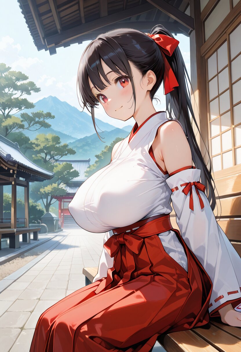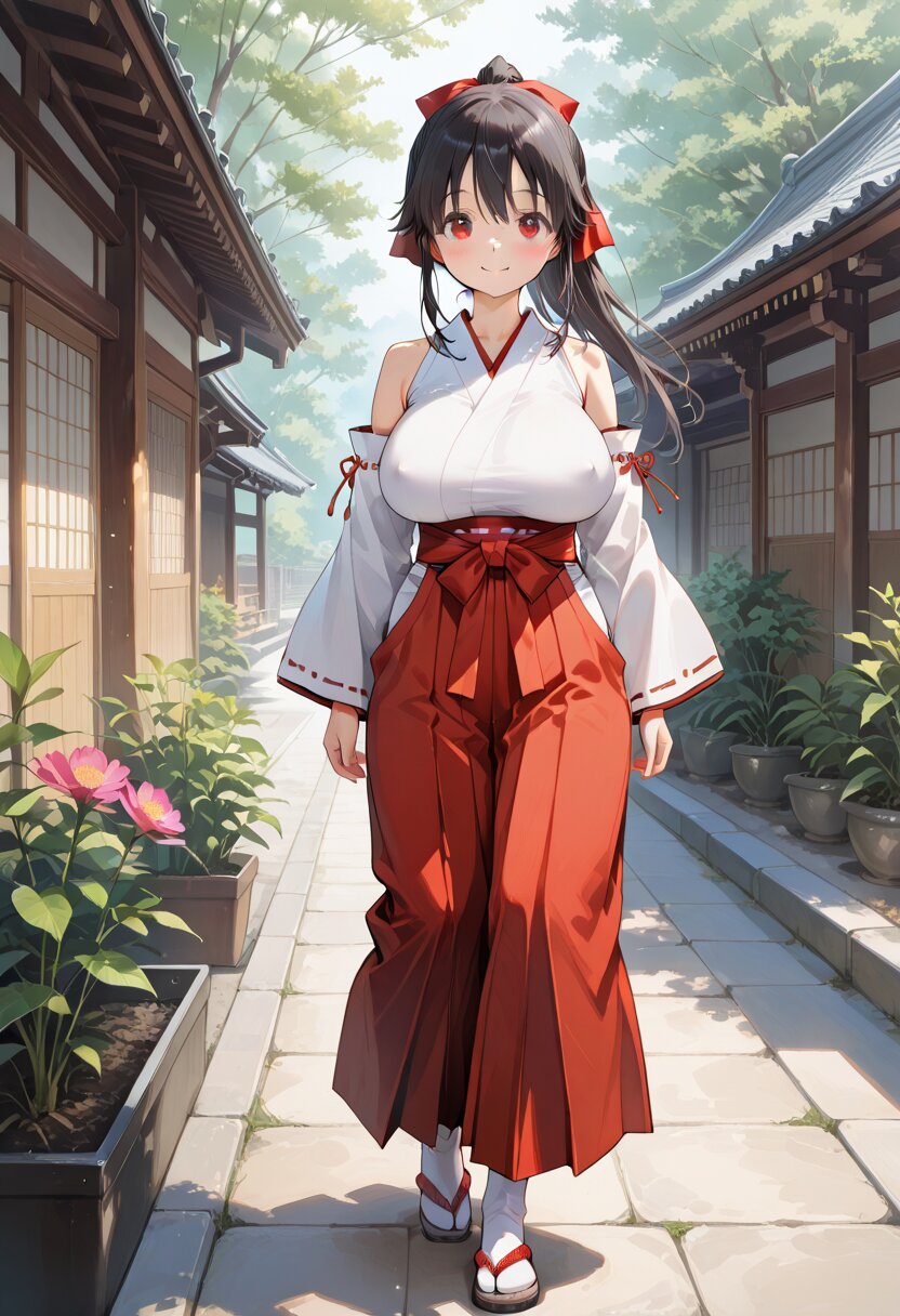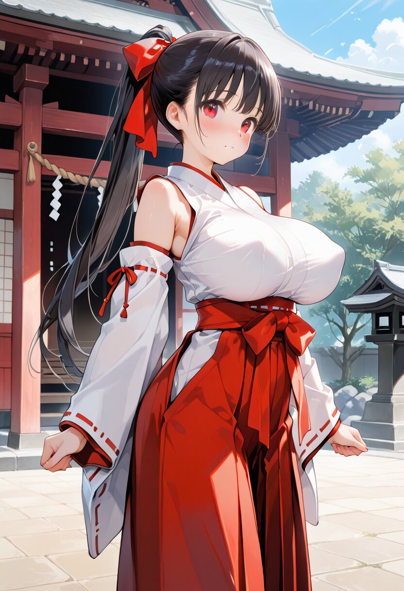 masterpiece, best quality, amazing quality, general, fine detail, official art, 1girl, (loli:1.2), beautiful black hair, Ponytail, beautiful red eyes, red ribbon miko, red hakama, detached sleeves, huge breasts, erect nipples, perky breasts, bare shoulders, slim legs, slim hip, Japanese shrine, , Shrine Maiden Dance, have a Purification stick, dynamic action, innocent expression, blush,