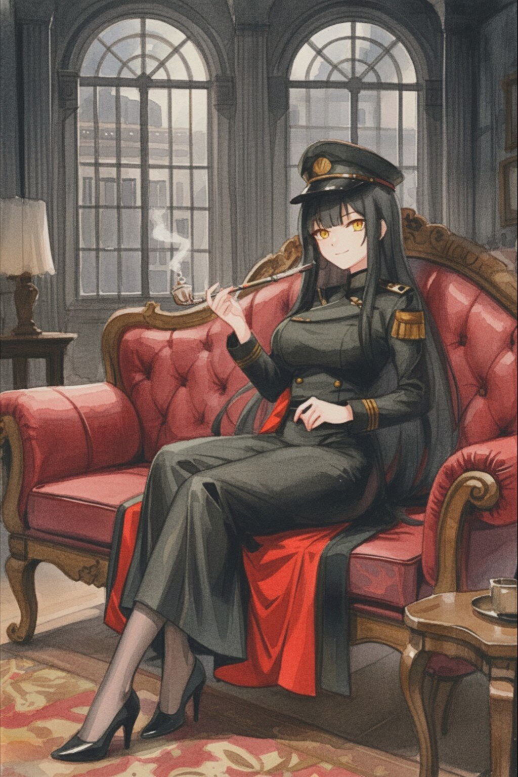 anime style, a mysterious general girl, tall, large s, long black hime-cut hair, sideburns, straight hair, piercing yellow eyes, wearing a black military uniform with gold accents, a long skirt that reaches her ankles, high heels, and a military cap. she is holding a long-stemmed smoking pipe, taking a puff with a suspicious smile. she is lying languidly on a red antique sofa in an antique room. the room has large windows with a view of a cloudy, dark sky, and a rich, ornate rug is on the floor. there are subtle hints of halloween decorations, like a pumpkin in the background.