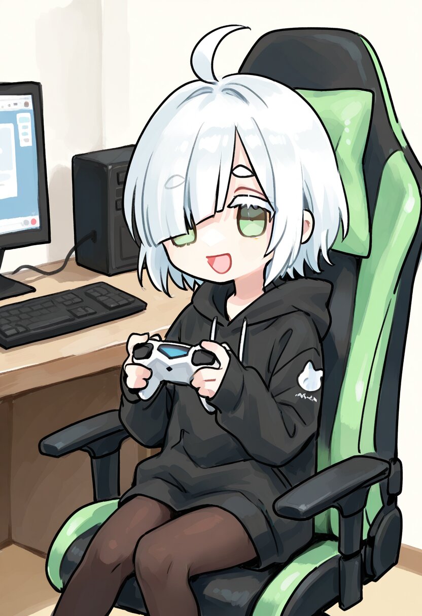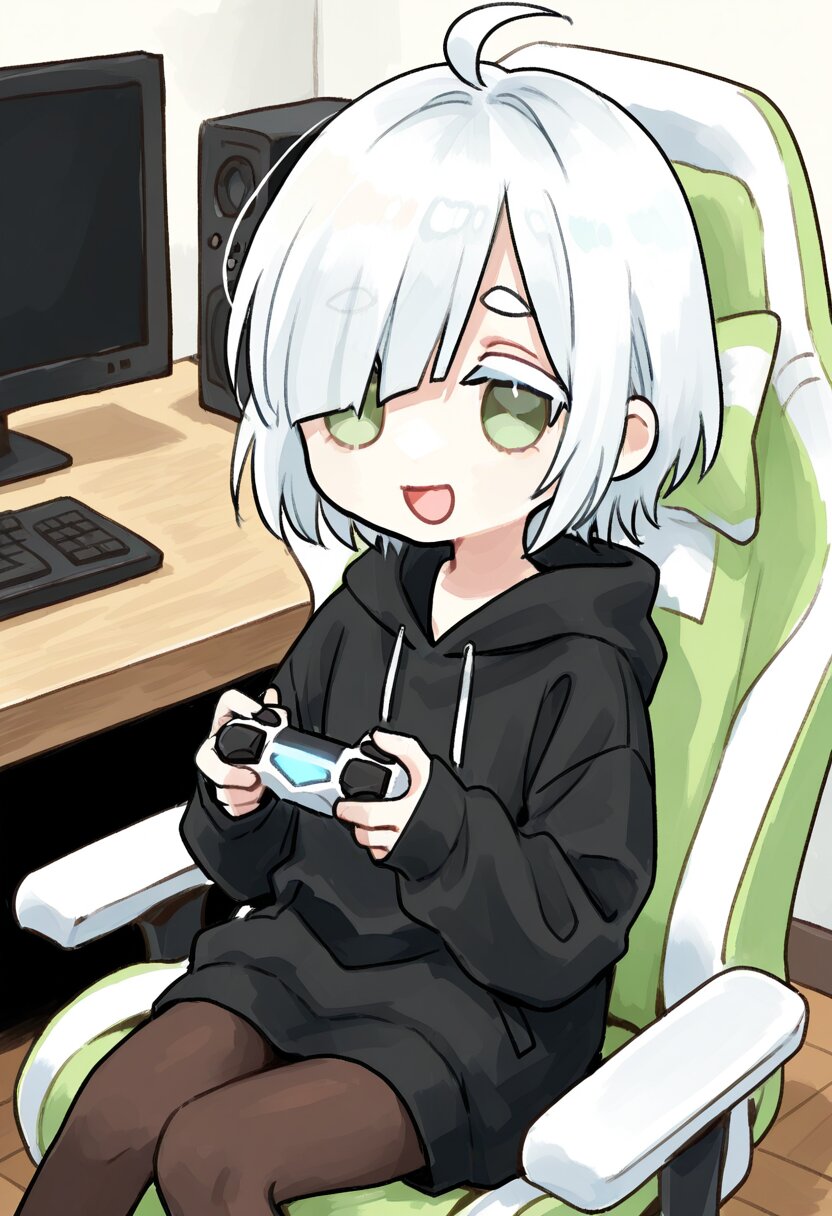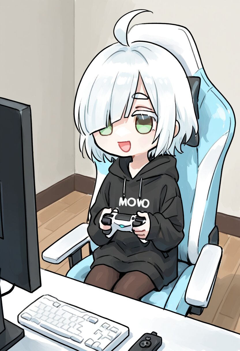 <lora:inmnstyleilxl:0.9>, best quality, masterpiece, very aesthetic, watercolor painting, general, 1girl, chibi, solo, (bright white hair), short hair, blunt bangs, white thick eyebrow, white colored eyelashes, (hair over one eye), ahoge, mintgreen eyes, smile, open mouth, oversize black hoodie, sleeves past wrists, brown tights, computer, desk, holding game controller, sitting gaming chair