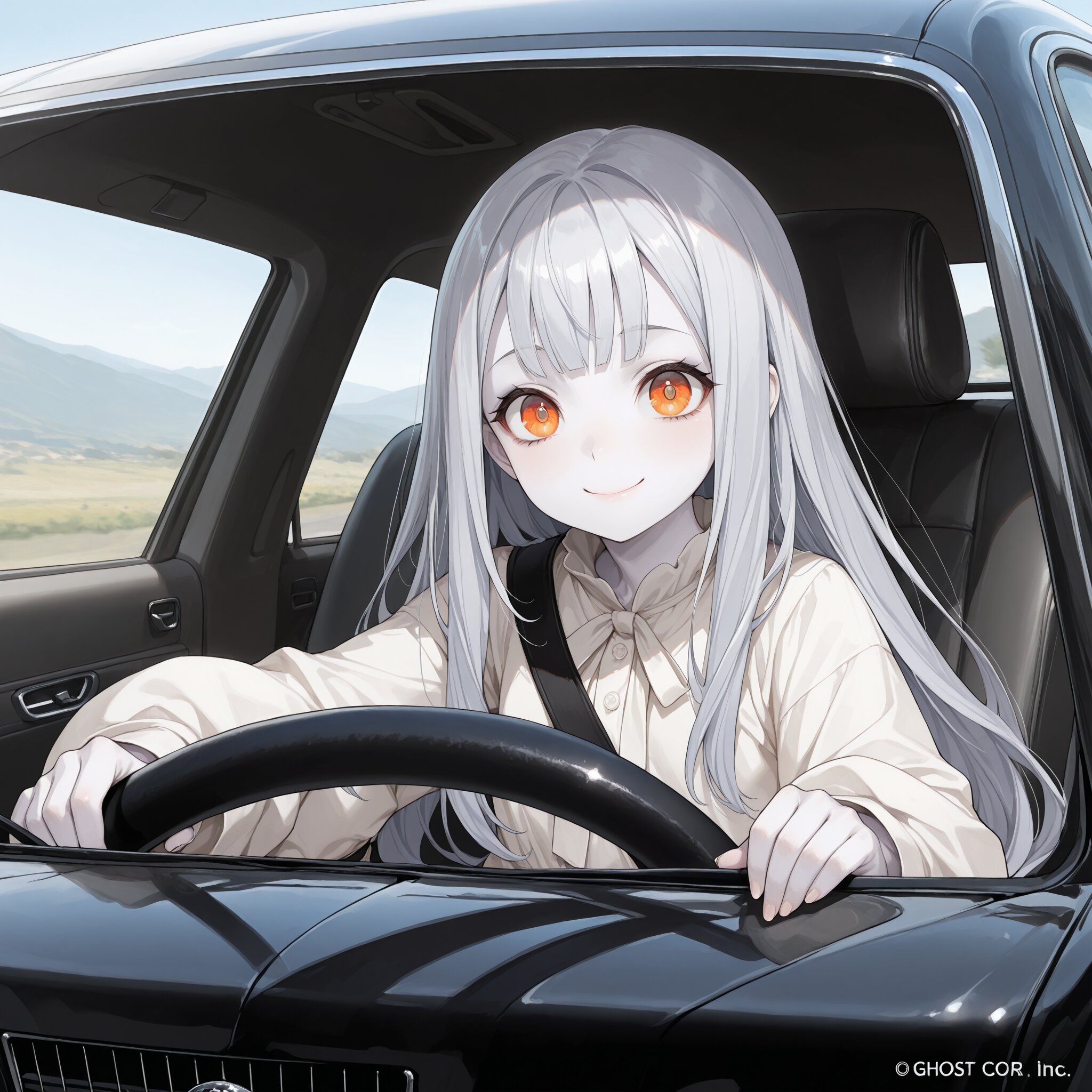 masterpiece, best quality, amazing quality, general, fine detail, official art, 1girl, ghost girl, silver hair, long hair, pale skin, orange eyes, center-flap bangs, smile, (A girl is driving around in a car shaped like a monster with some cute white monsters:1.3)