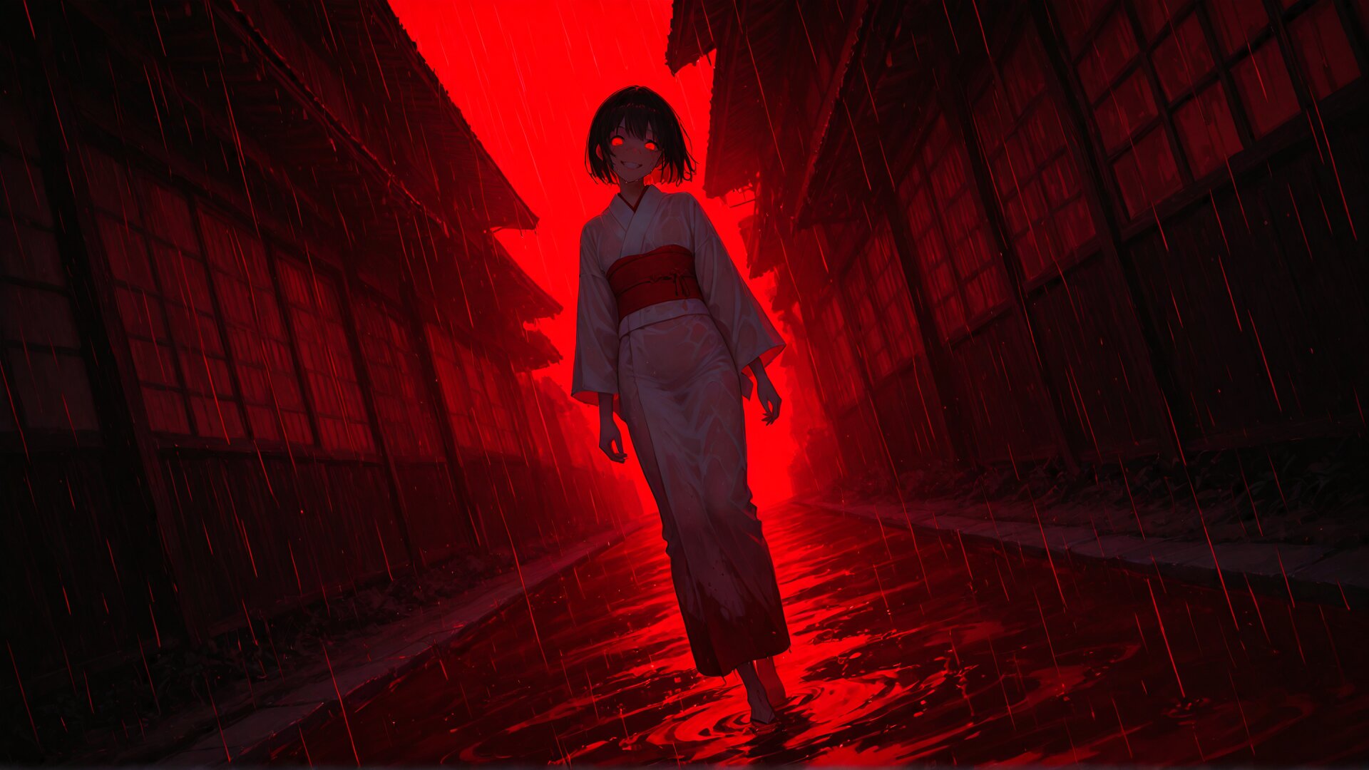 at night,outdoor,japanese traditional home, 1 girl,solo,walking,blood pool,red lighting,red hour,(artistic shot:1.1),horror \(theme\),minimalism,Japanese style, silhouette,glowing eyes,red eyes,black hair,short hair,white kimono,red obi,empty eyes,crazy smile,head tilt,ripple,standing,rain,w-arms, dutch angle,wet clothes,, appropriate posture,appropriate configuration,ideal ratio body proportions,perfect anatomy, <lora:Fixhands_anime_bdsqlsz_V1:1>, masterpiece,best quality,newest,absurdres,highres,ultra high res,8K UHD,hyper-detailed,