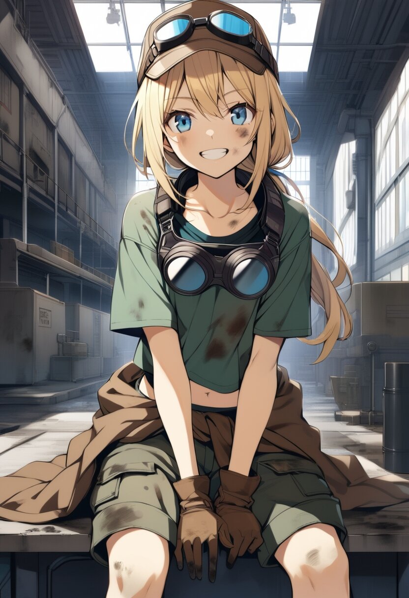 Highly detailed, 1girl, solo, 15years old, looking at viewer, (dirty skin, dirty clothes, dirty face), goggles around the neck, long hair, low ponytail, blonde hair, blue eyes, teeth, (workcap), darkgreen tank top, collarbone, navel, midriff, stomach, clothes around waist, cargo pants, brown work boots, brown gloves, hand between legs, sitting on desk, from front, factory, indoors,