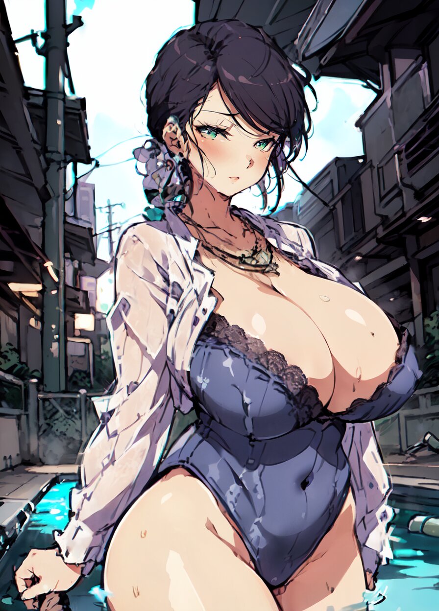 from front, (8k, best quality, masterpiece:1.6), (sexy pose: 1.6), 1woman, 46 years old, mature woman, (Lace leotard, earrings and necklace: 1.6), (chubby, short cut: 1.4), (huge breasts:1.6), beautiful detailed face, (cowboy shot: 1.6), perfect skin, detailed skin texture, looking aside, (dark daylight: 1.6), (((in the pool))), <lora:mama_v01:1>