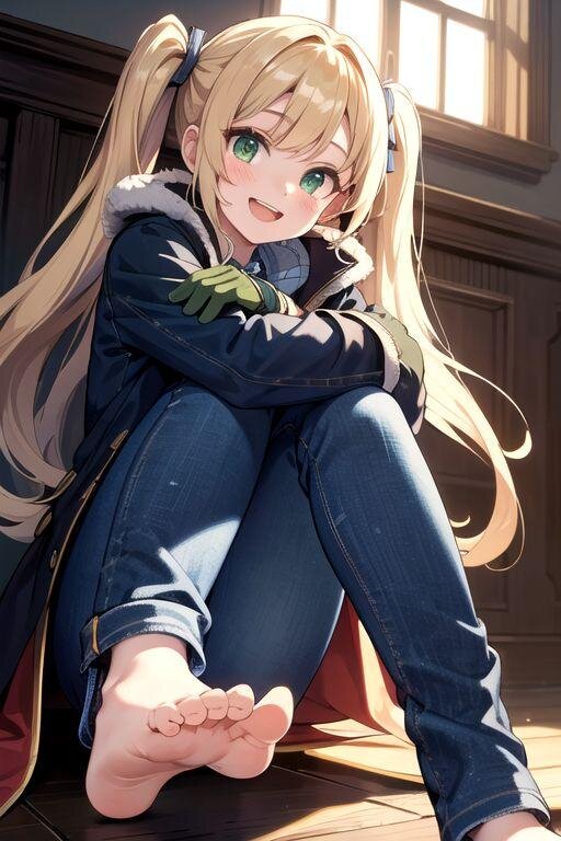 blonde hair, very long hair, twintails, green eyes, gloves, barefoot, (long toes:1.3), (long jeans:1.4),(coat:1.3),smile,open mouth