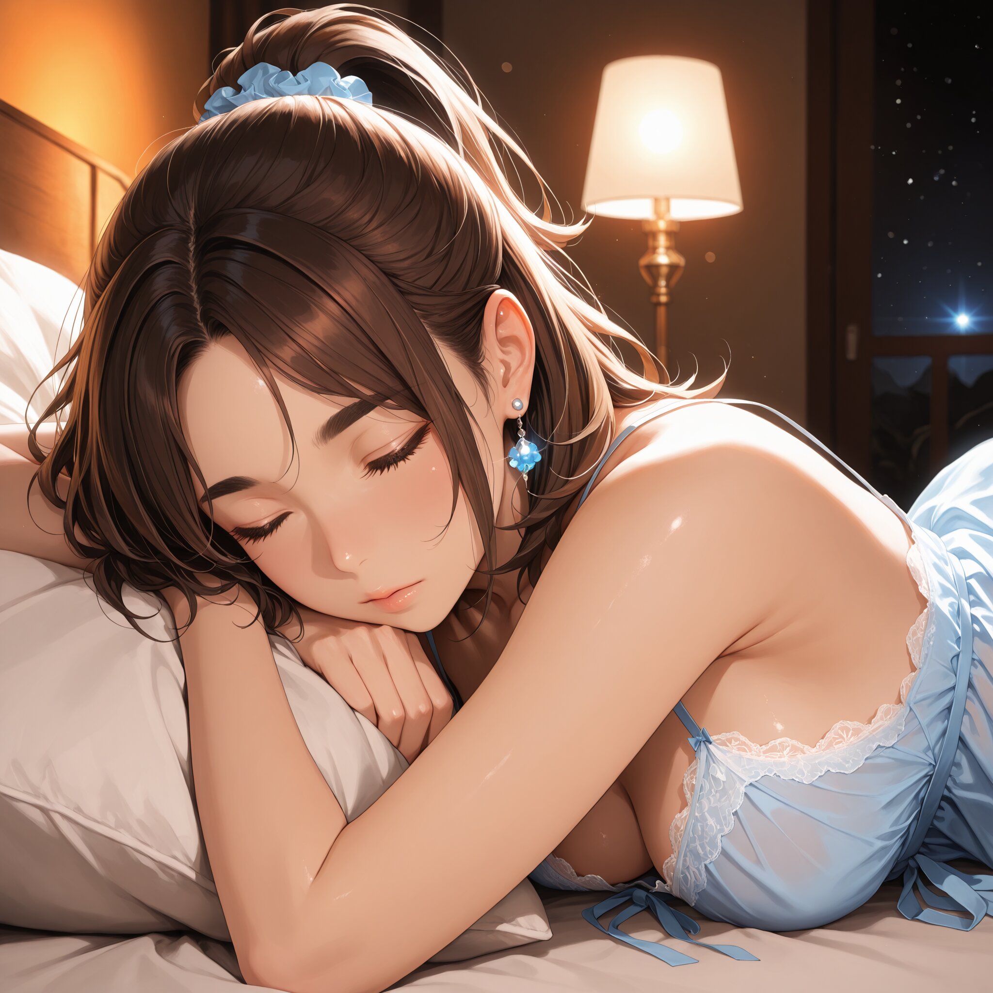 masterpiece, best quality, photorealistic, sharp focus, cinematic lighting, depth of field, beautiful composition, vibrant colors, ultra high res, 8K, highly detailed, masterpiece, best quality, very detailed, Masterpiece, best quality, highres, amazing quality, KJOmomo, featuring brown hair, brown eyes, medium hair, parted bangs, thick eyebrows, earrings, and a playful ponytail, is deeply asleep in a soft, sensual negligee. She's somehow ended up sprawled horizontally across the very edge of the bed, one arm dangling off, creating a precarious yet endearing sleeping position. The negligee clings gently to her form as she occupies the unusual space.