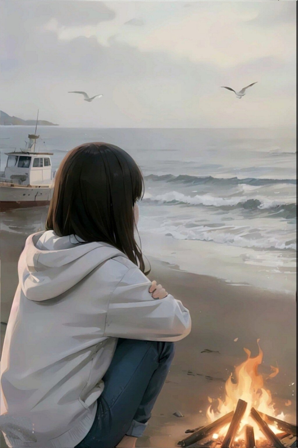 An anime-style illustration of a young girl crouching on a beach, facing away from the viewer, looking out at the ocean. She has long, dark hair and is wearing a white hoodie and blue jeans. Her arms are crossed. In the foreground, to the right, a small bonfire burns brightly. In the background, the sea stretches out under a cloudy sky, with gentle waves breaking on the shore. A small fishing boat is visible on the sand to the left, and several seagulls fly in the sky. The overall atmosphere is serene and contemplative.