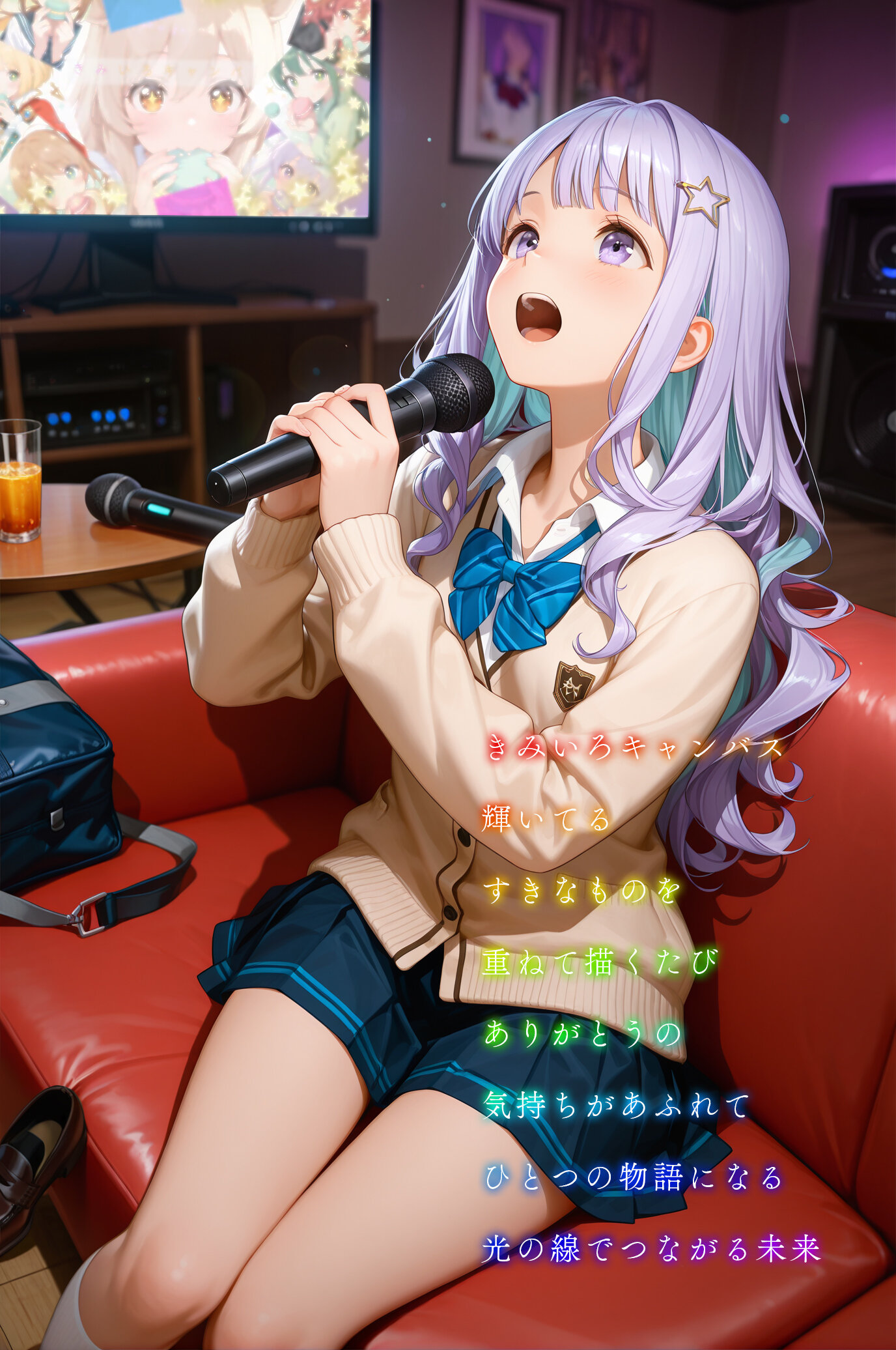 カラオケルームで「きみいろキャンバス」を熱唱するまゆらさんを生成してみました(*´▽`*)💗