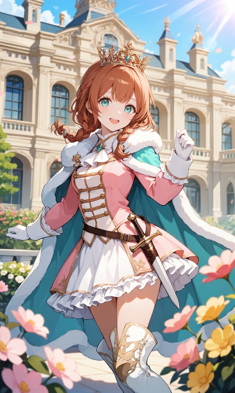 A 15-year-old girl with rosy-brown hair styled in (twin braids:1.3) and large, expressive (azure eyes:1.2) stands outside a grand palace with rococo architecture. Her delicate, beautiful face features a happy smile, and her detailed skin and hair enhance her youthful charm. She wears a (Pink luxurious Prince costume:1.6) with long sleeves, a (Light Blue luxurious Cape:1.3), and a (White luxurious mini skirt with White frill:1.4). Her outfit is completed with (White luxurious Boots:1.3), a (dagger on waist:1.3), a (luxurious crown:1.4), and (White gloves:1.2). She strikes a cute pose, exuding a romantic academia aesthetic. The afternoon sunlight bathes the scene in soft lighting, with lens flare and a blue sky overhead. Flowers bloom around her, enhancing the light, dreamy atmosphere. The intricate details of her attire, the palace's ornate design, and the lush surroundings create a masterpiece of insanely detailed, 16k-quality beauty.