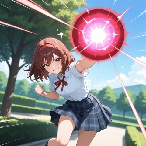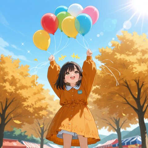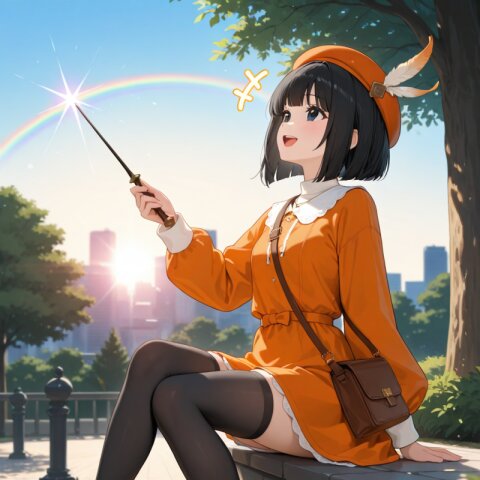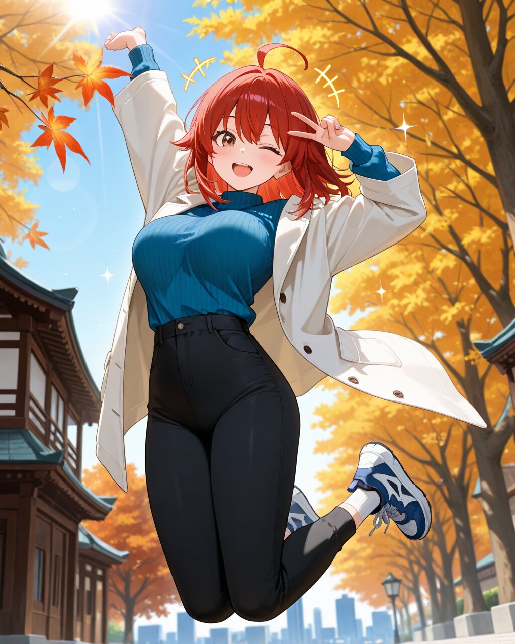 masterpiece, best quality, amazing quality, 4k, very aesthetic, high resolution, ultra-detailed, absurdres, newest, scenery, 1girl, crimson straight medium hair, ahoge, brown eyes, blue sweater, cardigan, black pants, white coat, socks, sneakers, large breasts, BREAK happy, open mouth, arm up, v, jumping higher, cityscape, pavilion, one eye closed, autumn tree, clear sky, sunlight, lens flare, sparkling aura, +++, BREAK depth of field, volumetric lighting