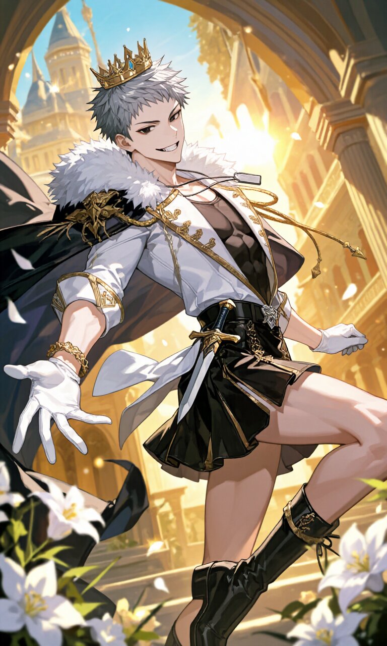1boy, a strikingly handsome young man with silver hair styled in short, spiked locks and short bangs, exudes an air of both elegance and danger. His sharp, black eyes gleam with mischief under delicate yet evil eyes, complemented by a devilish grin revealing subtle fangs. He wears a (White luxurious Prince costume:1.6) with an open front, revealing a fitted black tank top underneath, and long sleeves rolled up to his forearms, where a bracelet adorns his wrist. His attire includes a (Black luxurious mini skirt:1.4) that contrasts with his bare thighs, and (Black luxurious Boots:1.3) that complete his regal yet rebellious look. A (Black luxurious Cape:1.3) flows dramatically behind him, and a (luxurious crown:1.4) rests atop his head, signifying his royal status. A (dagger on waist:1.3) hints at his combat prowess, while (White gloves:1.2) add a refined touch. His dog tag necklace and flexible muscles add a rugged charm to his otherwise delicate and beautiful features. The setting is a grand palace with organic architecture, bathed in the golden light of afternoon sunlight, with a blue sky, shining lights, and lens flare enhancing the romantic academia atmosphere. Flowers bloom around him, and the dynamic pose captures his confident and enigmatic presence.