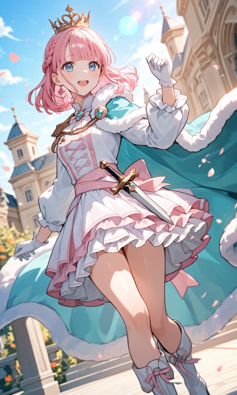 1girl, solo, a young girl with pastel pink, medium-length hair styled in french braids and blunt bangs, her delicate face framed by soft strands. Her bright blue eyes sparkle with joy as she wears a happy smile, exuding charm and innocence. She is dressed in a (White luxurious Prince costume with Pastel Pink trim:1.6), featuring long puff sleeves and a (luxurious layered frilly mini skirt:1.4), all exquisitely detailed with intricate lace and embroidery. A (Pastel Blue luxurious Cape:1.3) drapes elegantly over her shoulders, flowing behind her in the gentle breeze. She wears (White luxurious Boots with ribbon ties:1.3) and (White gloves:1.2), completing her princely attire. A (dagger on waist:1.3) hints at both elegance and adventure, while a (luxurious crown:1.4) rests atop her head, shimmering in the sunlight. A (big ribbon at the waist:1.3) adds a final touch of regal flair. The scene is set outside a grand palace with rococo architecture, bathed in romantic academia aesthetics. The dreamy atmosphere is enhanced by the soft afternoon sunlight, a clear blue sky, and delicate lens flares, casting a warm, ethereal glow over the entire composition. The image is a masterpiece of insanely detailed rendering, with lifelike textures in her skin, hair, and luxurious clothing, all contributing to a breathtaking 16k-quality fantasy portrait.