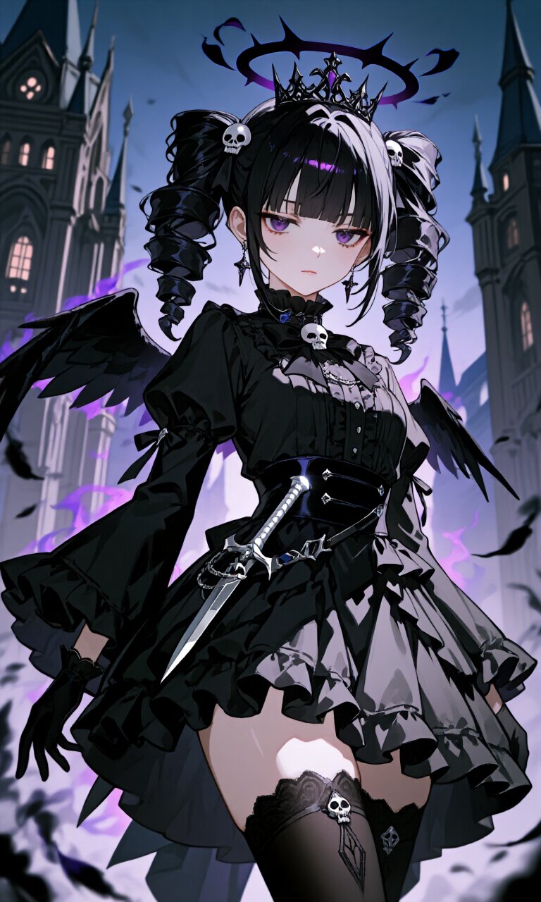 1girl, an 18-year-old girl with striking black twin drill hair and deep purple jitome eyes stands expressionless in a mystical twilight setting. Her delicate yet detailed face features flawless skin, and her beautiful hair cascades in intricate waves. She wears a (Black luxurious Gothic Prince costume:1.6) with long sleeves, a (luxurious mini skirt:1.4), and (Black luxurious thighhighs:1.3). A (dagger on waist:1.3) gleams subtly, while a (luxurious Black crown:1.4) rests atop her head, accompanied by a faint (black halo:1.3). Her (black wings folded behind:1.2) and (luxurious Black gloves:1.2) complete her regal yet dark attire, adorned with (skull motif accessories:1.3). The background features a grand Palace with Gothic architecture, bathed in a romantic academia atmosphere. Outside at midnight, a (dark aura, black smoky haze floating subtly around her:1.3) enhances the mystical ambiance. The scene is rendered in insanely detailed 16k quality, emphasizing her beautiful yet eerie presence.