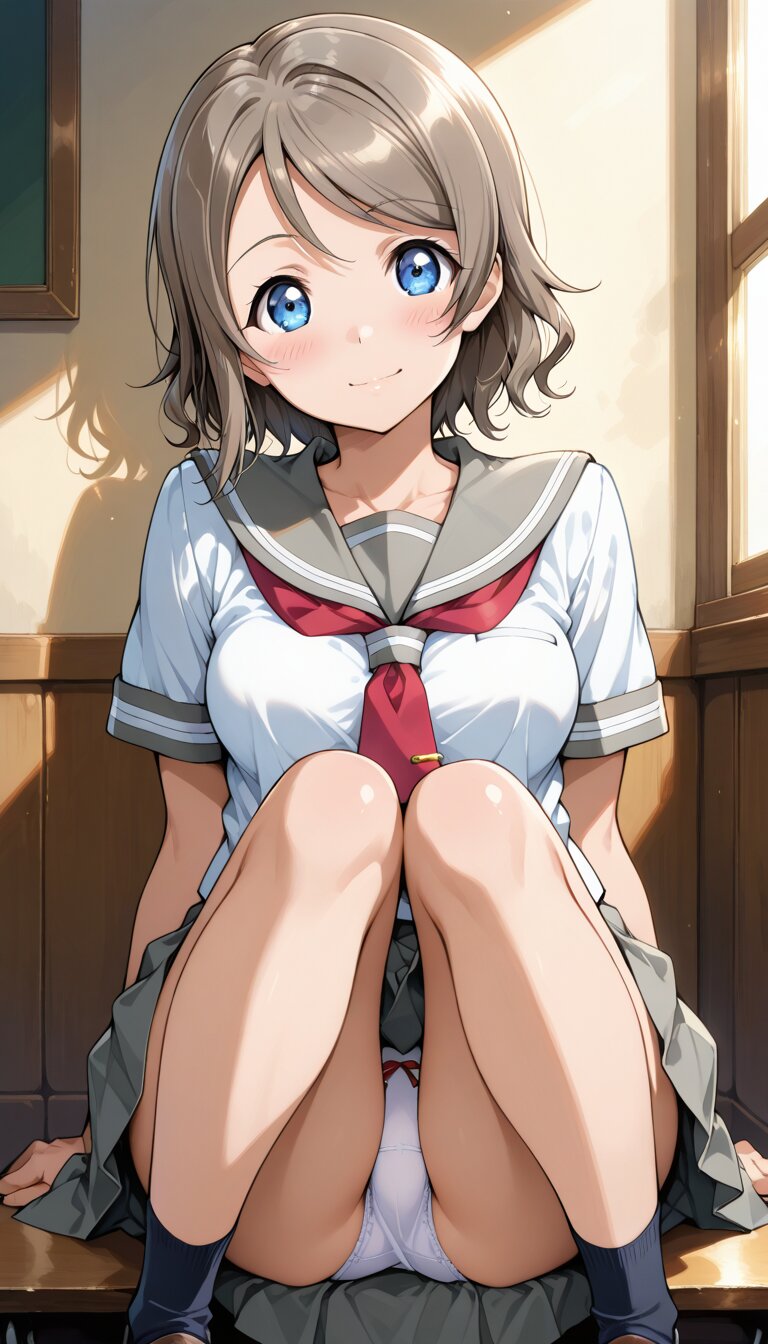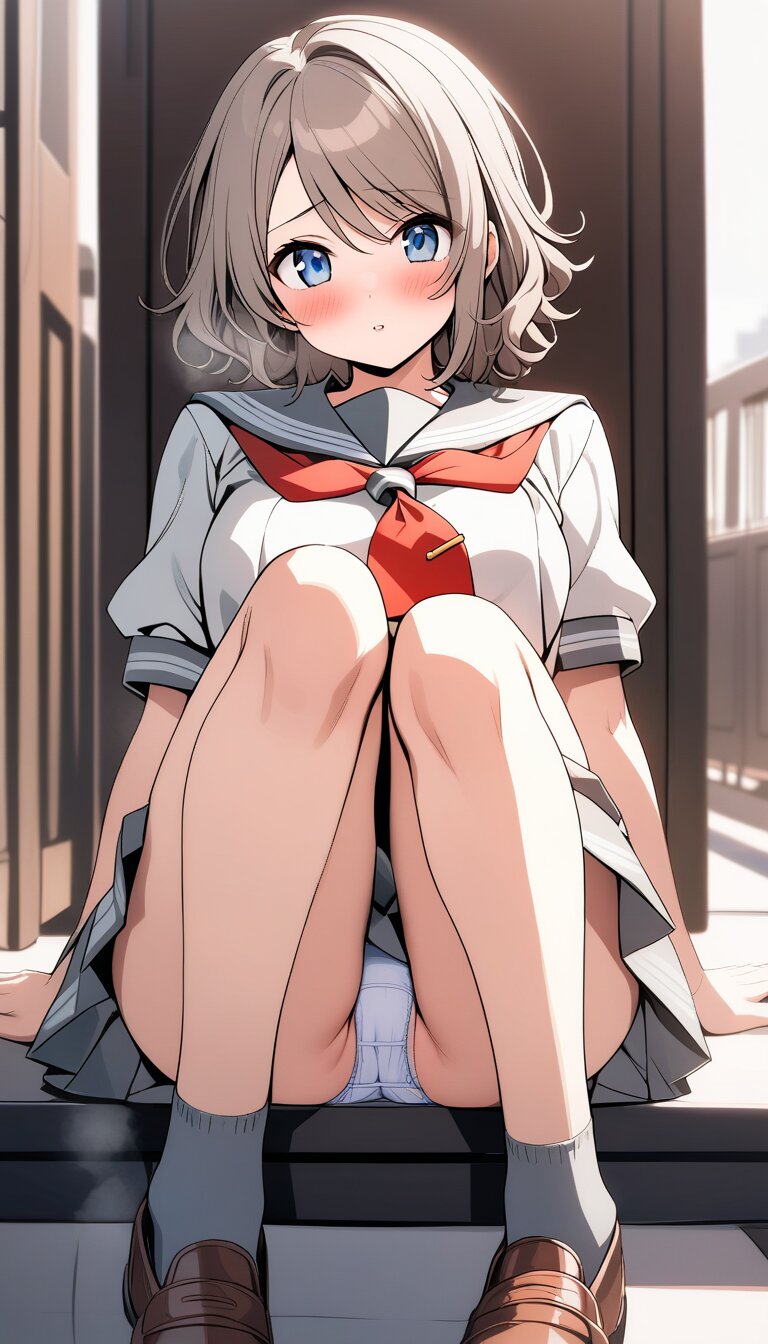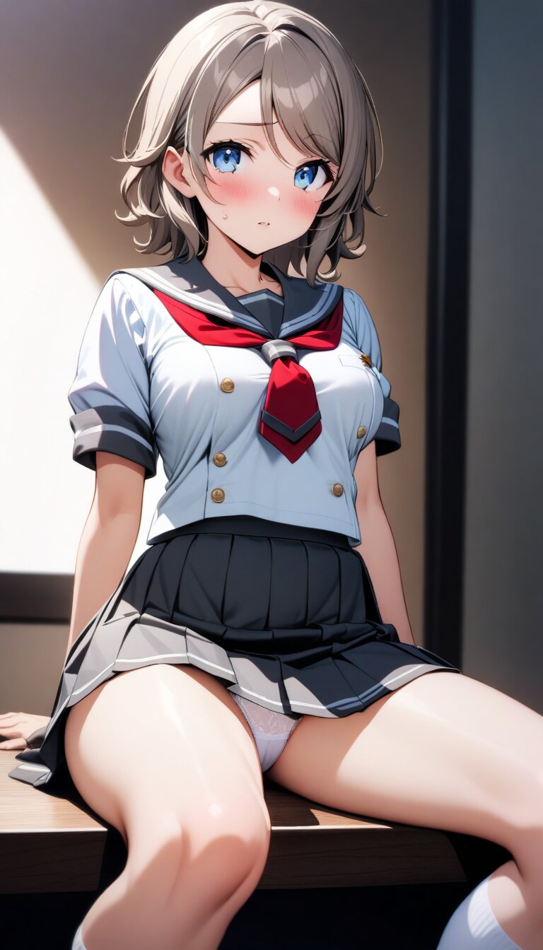 best quality,absurdres,8k,ultra detailed,very aesthetic, a anime style character drawn with girl's clothing and underwear down to the legs, 1girl, watanabe you, blue eyes, brown hair, short hair, swept bangs, medium breasts, uranohoshi school uniform, red ribbontie, underwear, panties, school uniform, solo, serafuku, sitting, skirt, white panties, looking at viewer, socks, blush,