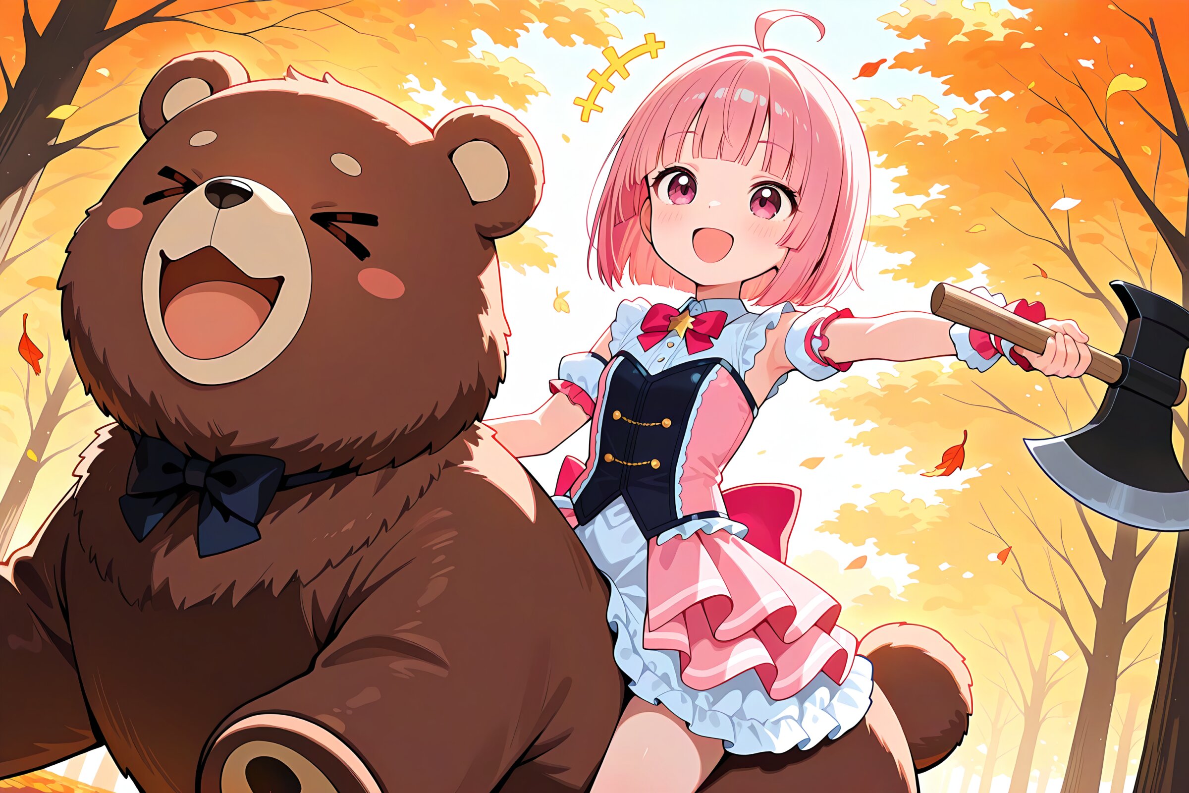 1 little girl, solo, diagonal angle, masterpiece, best quality, amazing quality, very aesthetic, pink hair, ahoge,hime cut,straight hair,short hair,dark pink eyes,delicate face,detailed face,detailed skin, detailed hair, open mouth, smile, cheerful, +++, notice lines, pink idol clothes, battle costume, holding japanese axe, riding animal, little bear, > <, autumn,