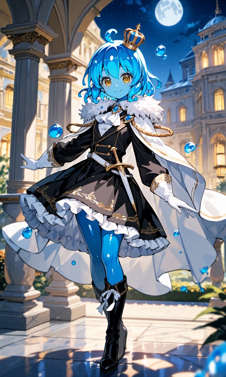 blue_girl, a cheerful slime girl with short, vibrant blue hair and large, round yellow eyes, smiles gently with her mouth closed, radiating happiness. She wears a (Black luxurious Prince costume:1.6) with long sleeves, paired with a (White luxurious Cape:1.3) and a (luxurious mini skirt with White frill:1.4). Her outfit is completed with (Black luxurious Boots with ribbon ties:1.3), (White gloves:1.2), and a (luxurious crown:1.4) atop her head. A (dagger on waist:1.3) adds a regal touch to her appearance. Her delicate face, beautiful eyes, and flawless skin are highlighted by soft lighting, emphasizing her dreamy, romantic academia aesthetic. The scene is set outside a grand Palace with art deco architecture, bathed in moonlight under a starry sky. The dreamy atmosphere is enhanced by the soft glow of lanterns and the shimmering reflections on marble surfaces. The background features intricate details, from the ornate pillars to the lush gardens, creating a magical, fairytale-like setting. The style is insanely detailed, with a focus on delicate textures, flowing fabrics, and luminous highlights, achieving a masterpiece-quality 16k resolution.