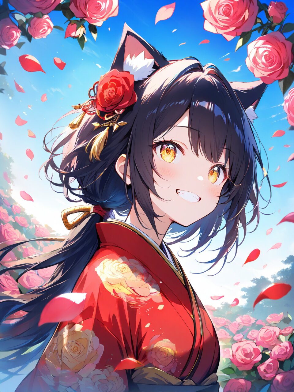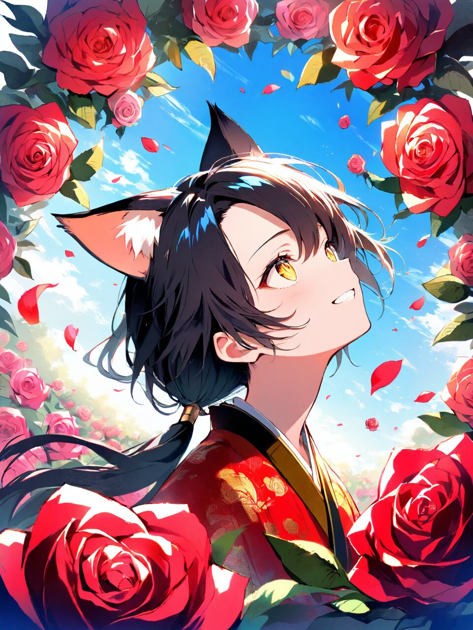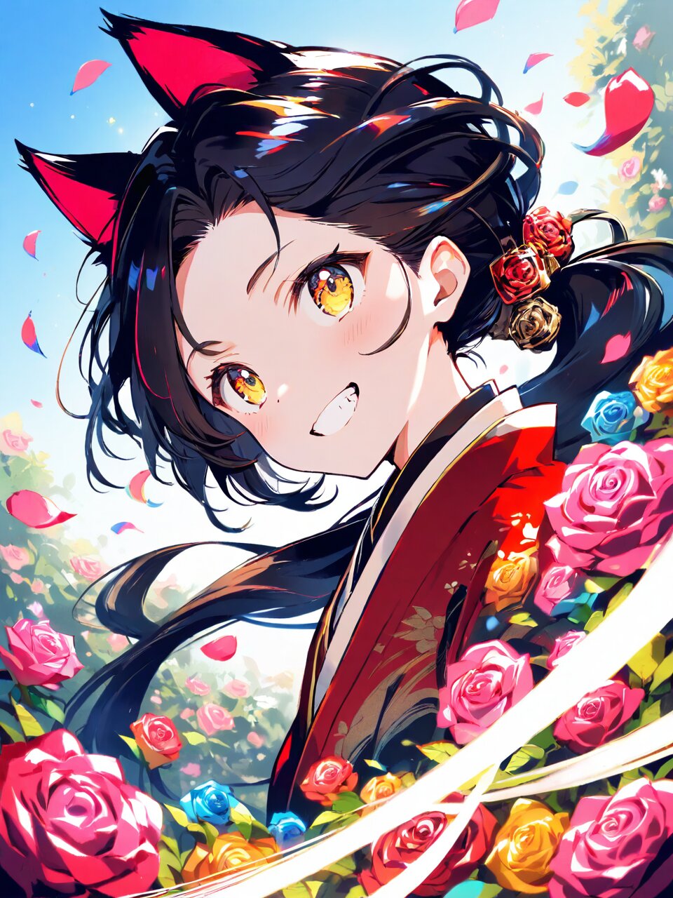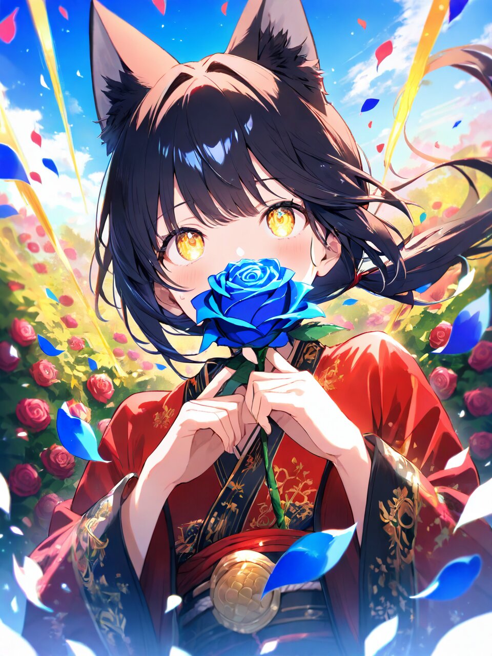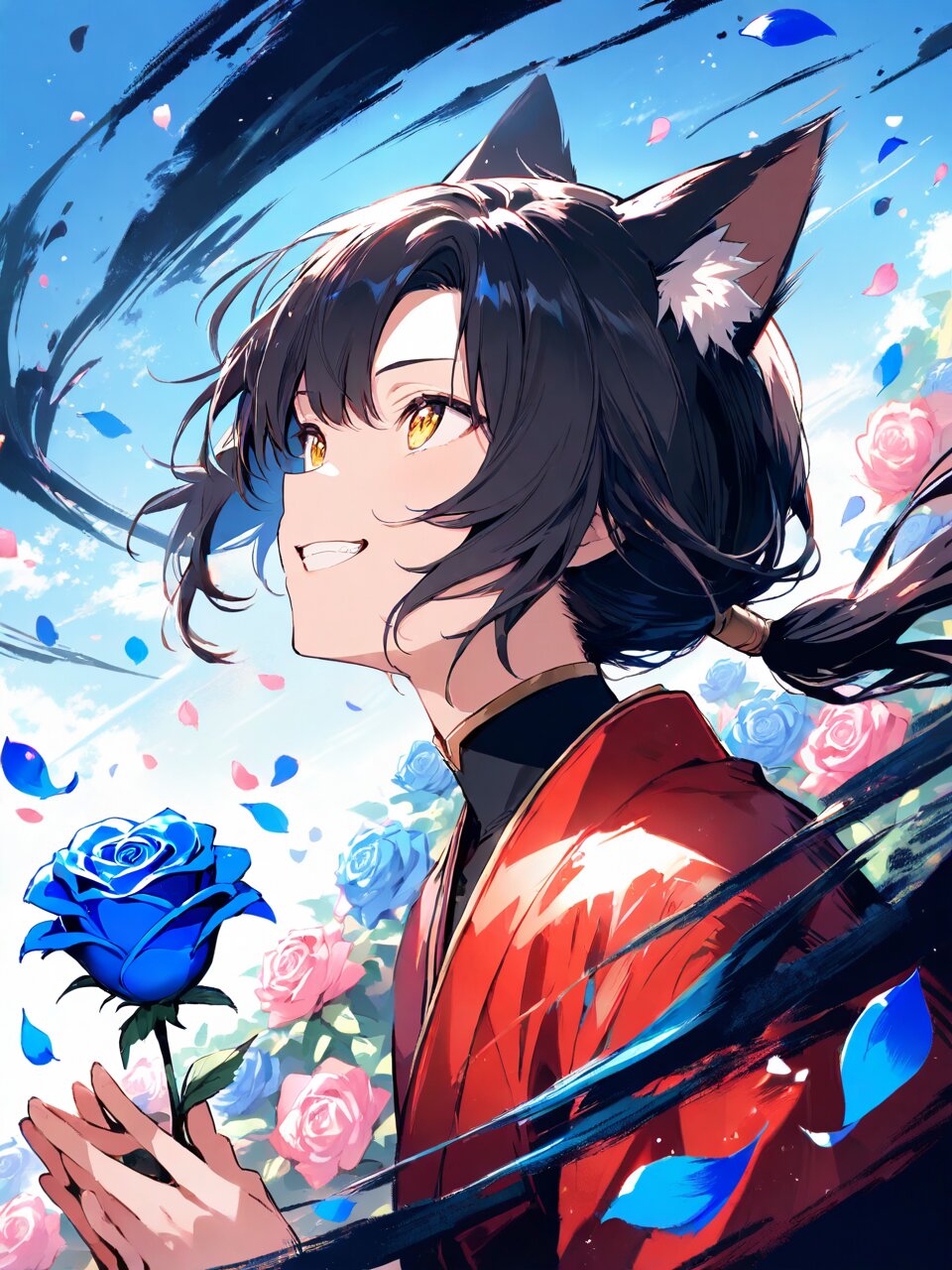 looking up sky, shining blue rose, rose garden, blue sky, shower of roses Petals, beautiful eyes, detailed hair, detailed eyes, gold amber eyes, low ponytail, black hair, cat ears, red samurai, grin