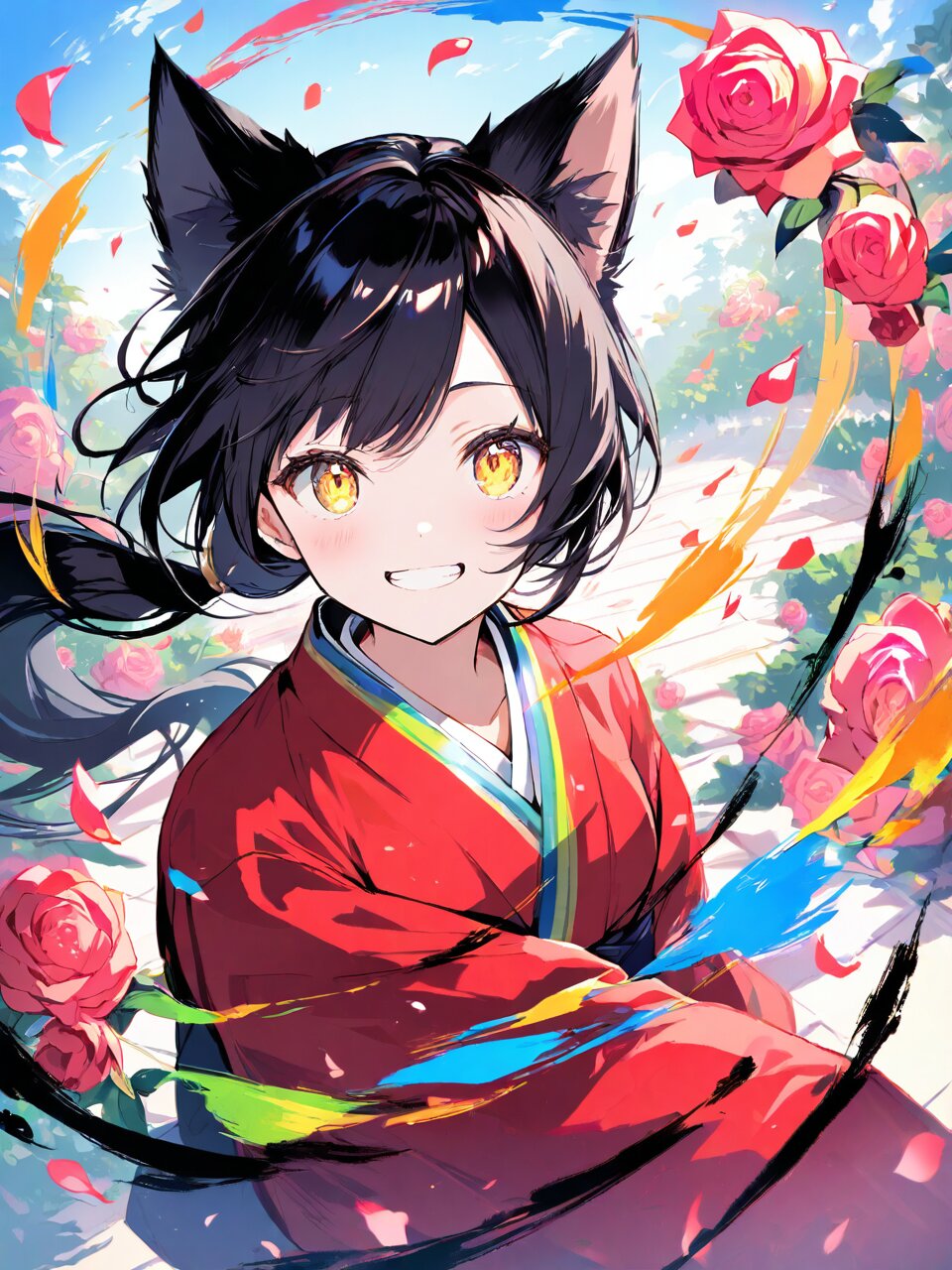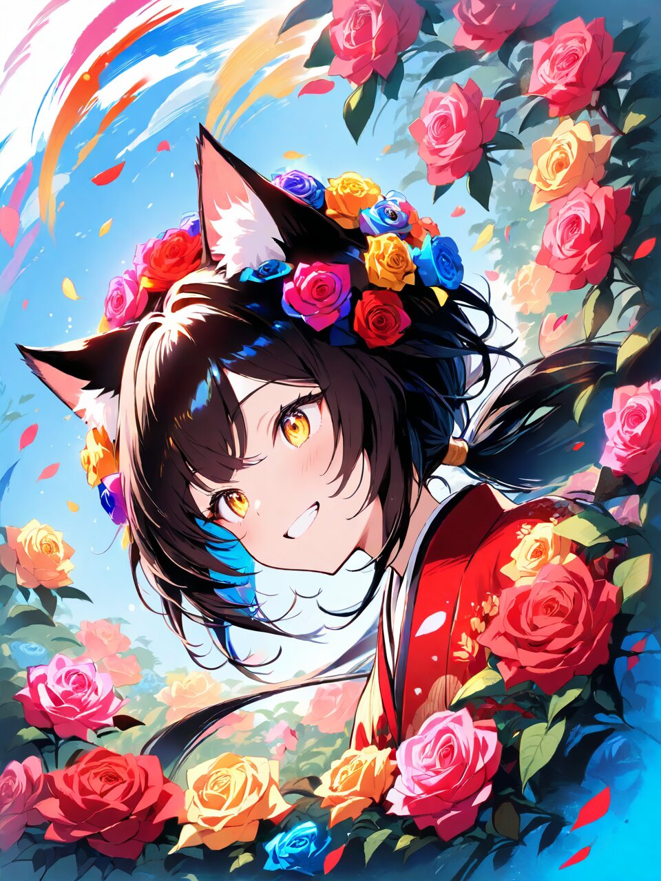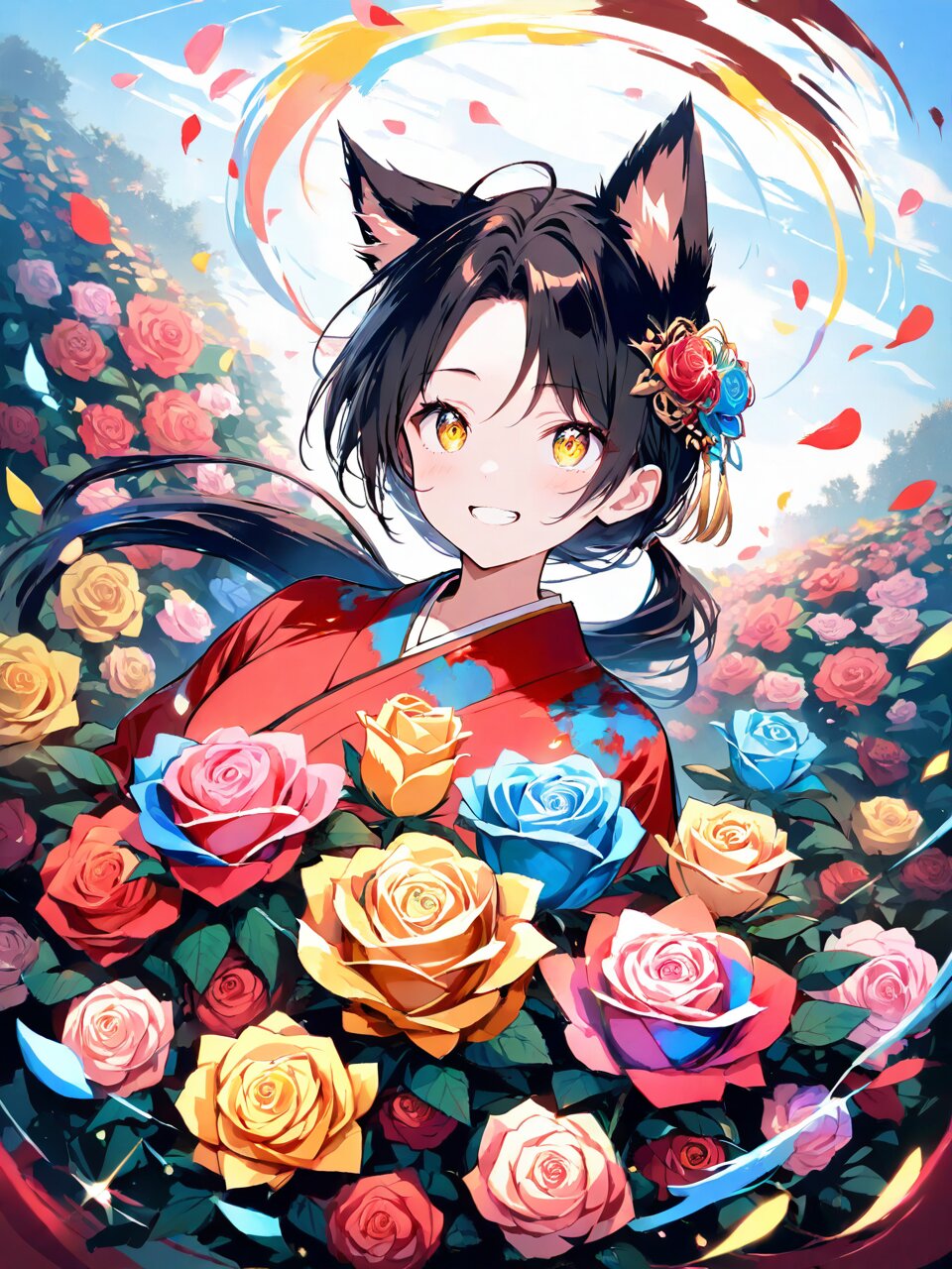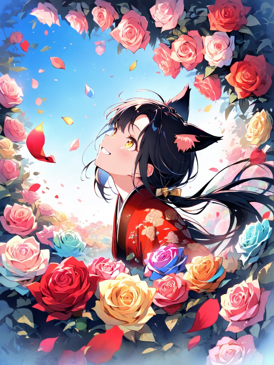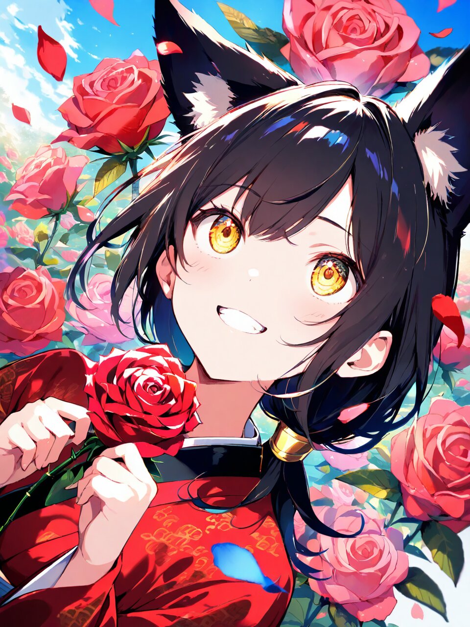 looking up sky, shining blue rose, rose garden, blue sky, shower of roses Petals, beautiful eyes, detailed hair, detailed eyes, gold amber eyes, low ponytail, black hair, cat ears, red samurai, grin