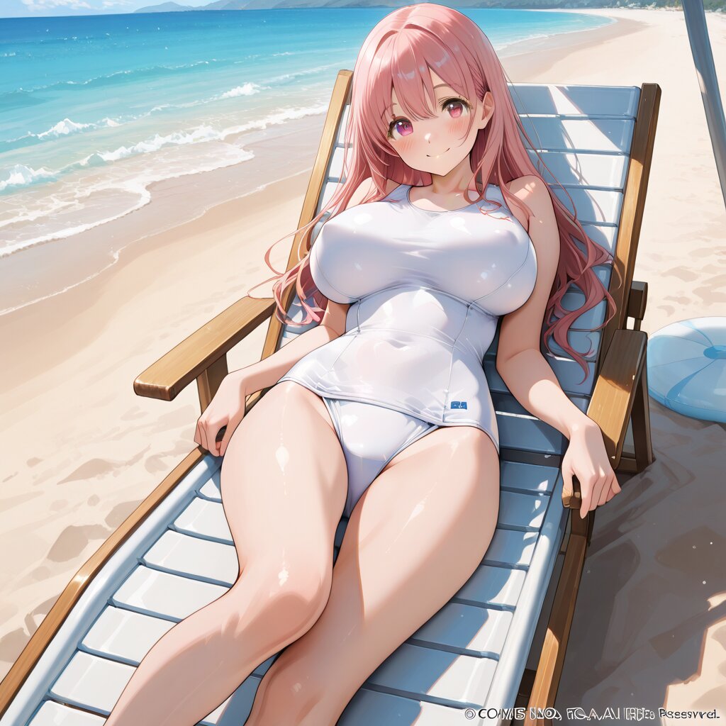 masterpiece, best quality, amazing quality, general, fine detail, official art, 1girl, beautiful pink hair, beautiful blue eyes, school swimsuit, white swimsuit, beautiful legs, slim legs, huge breasts, erect nipples, beach, Leaning forward, looking at viewer, innocent expression, wet skin, wet clothing, from below,