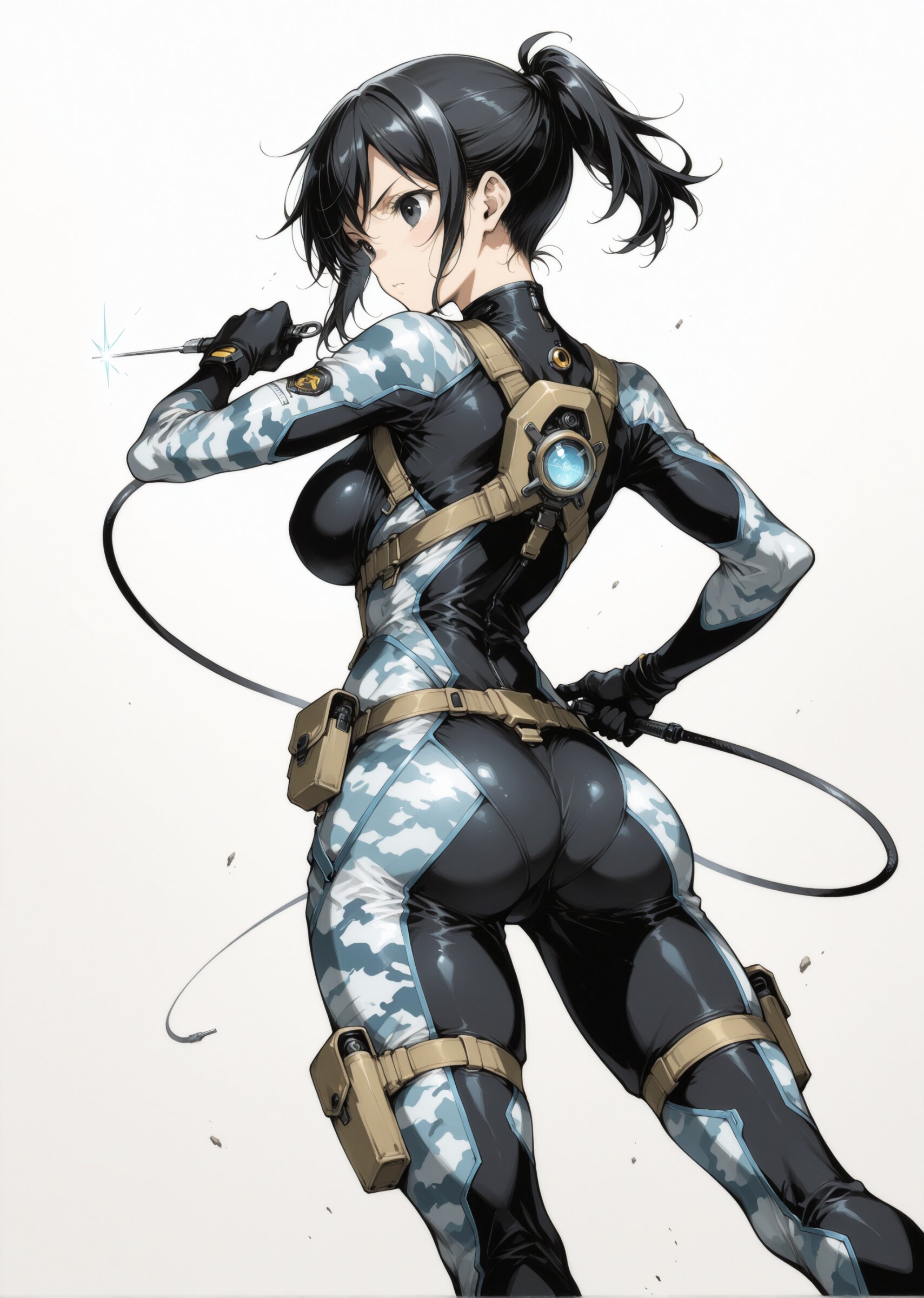Best quality, Masterpieces, simple background, negative space, anime-style illustration, fine detail, 1girl, (young girl), cute face and eyes, big breasts, black hair, clear black eyes, single short ponytail hair, cute and lovely, Vigorous, lively, and spontaneous personality, Combat expert bodysuit, Reinforced padding on key impact zones, Flexible yet durable material for unrestricted movement, Strategic ventilation for breathability during intense fights, Integrated pockets for carrying small tools, Camouflage patterns for blending into surroundings, Lightweight and agile design for swift maneuvers, dynamic pose, cinematic angle, cinemagraph style, dynamic perspective lines background, speed and depth, minimal sketch style, from behind,