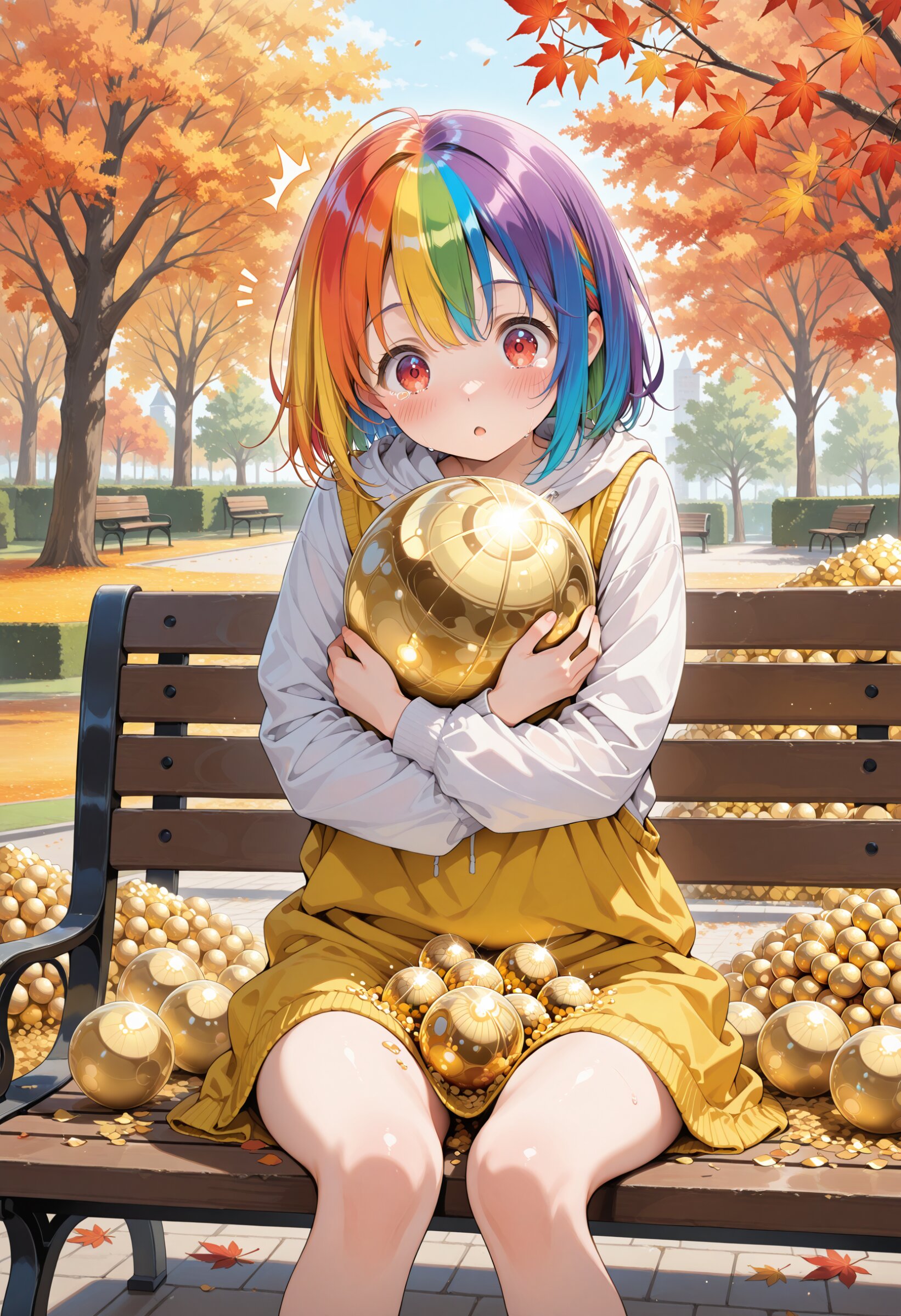 BEAUTIFUL INSTRUCTIONS, FANTASTIC INSTRUCTIONS WITH A SENSE OF TRANSPARENCY, MASTERPIECE, ABSURDRES, BEST QUALITY, HIGHRES, ULTRA DETAILED, HIGH RECTION, (PERFECT ANATOMY) ,4fingers,1girl, ((loli)),cute, kawaii, young girl,rainbow hair,random hair style, (blush), (^^^),((surprised)),tears,autumn clothes,(((hug golden ball)),((lots of gold balls around:1.5)),many golden ball,splash of golden ball,bench,park,autumn