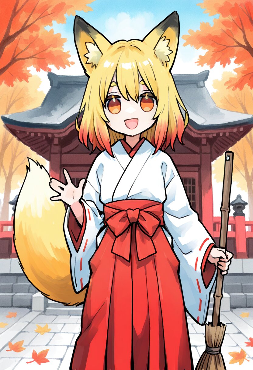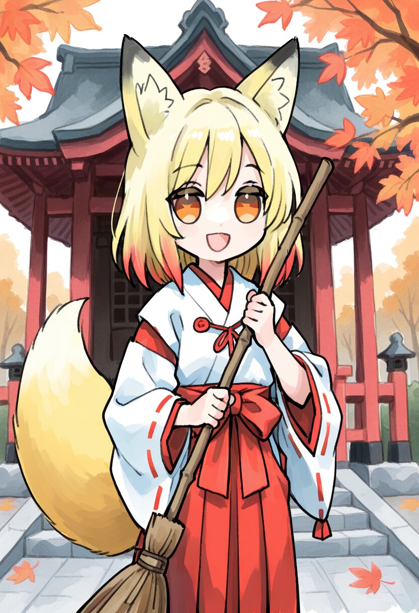 <lora:inmnstyleilxl:0.9>, best quality, masterpiece, very aesthetic, watercolor painting, general, 1girl, chibi, solo, yellow hair, red colored tips, medium hair, orange eyes, smile, open mouth, looking at viewer, fox ears, fox tail, longsleeves miko costume, holding broom, shrine, autumn