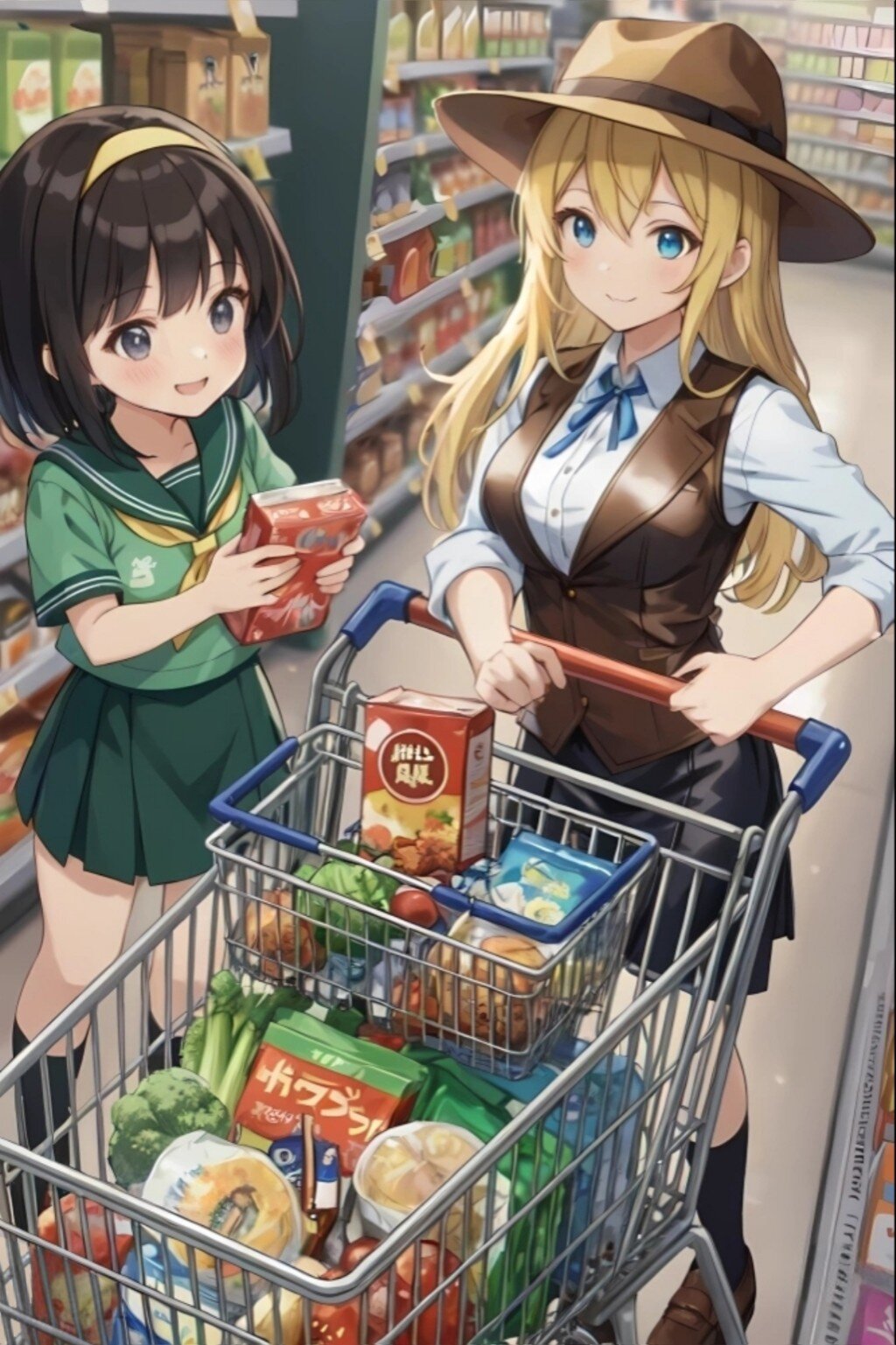 A cute anime girl and a slightly older anime woman are shopping in a supermarket. The girl has short dark hair with a yellow headband and is wearing a green sailor-style uniform. She holds a small red box. The woman has long blonde hair, blue eyes, and is wearing a brown hat, a white collared shirt, and a dark brown vest with a bow tie. She is pushing a shopping cart filled with various groceries like vegetables, packaged foods, and canned goods. The supermarket shelves are visible in the background, filled with products. The art style is clean and vibrant, resembling modern anime.