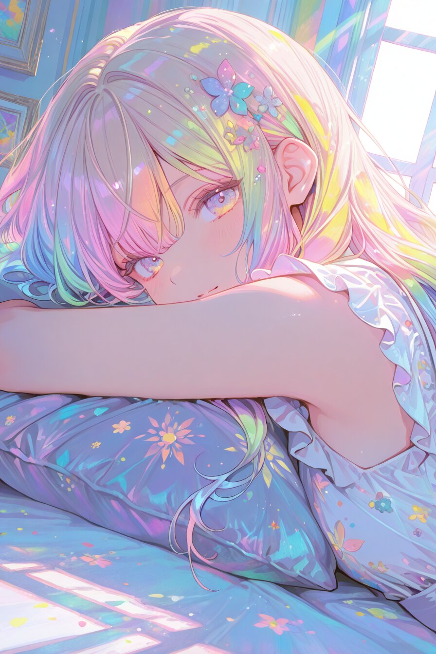 An anime girl with long rainbow-tinted hair, small flower hair accessories, gentle purple eyes, and a soft, sweet smile. She has a luminous, delicate, and cute atmosphere.