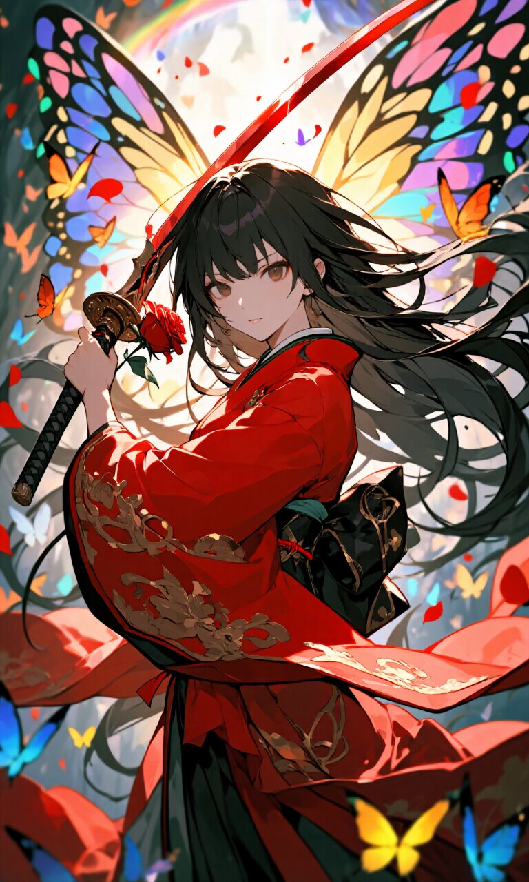 beauty with long black hair and brown eyes, clad in a crimson kimono, brandishing a rose—the unexpected sight of a young lady in battle, set against a backdrop of a rainbow-colored swarm of butterflies.