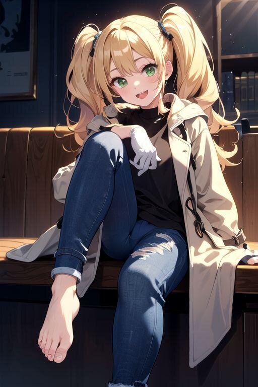 blonde hair, very long hair, twintails, green eyes, gloves, barefoot, (long toes:1.3), (long jeans:1.4),(coat:1.3),smile,open mouth