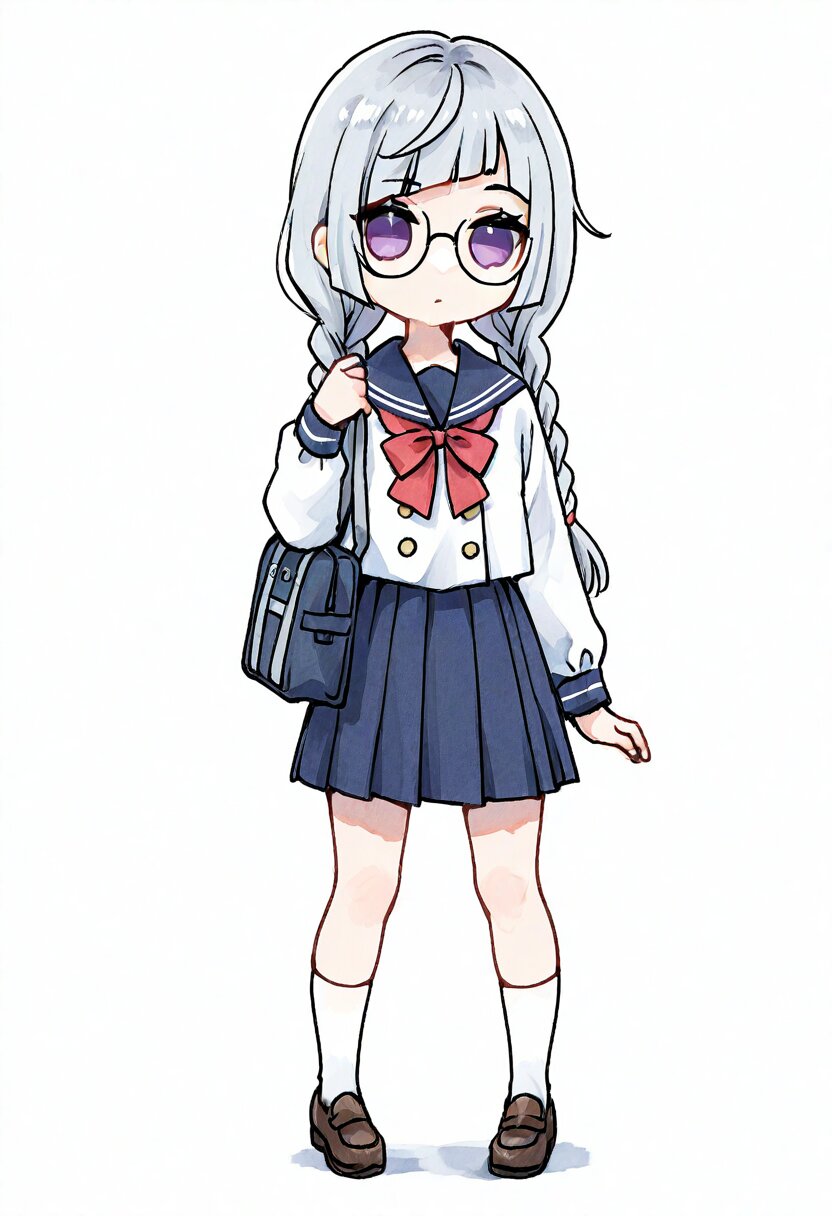 <lora:inmnstyleilxl:0.9>,best quality, masterpiece, very aesthetic, watercolor painting, general, 1girl, chibi, solo, silver hair, long braids hair, diagonal bangs, purple eyes, glasses, navy sailor suit, red ribbon, pleats skirt, white socks, brown shoes, school bag, white background