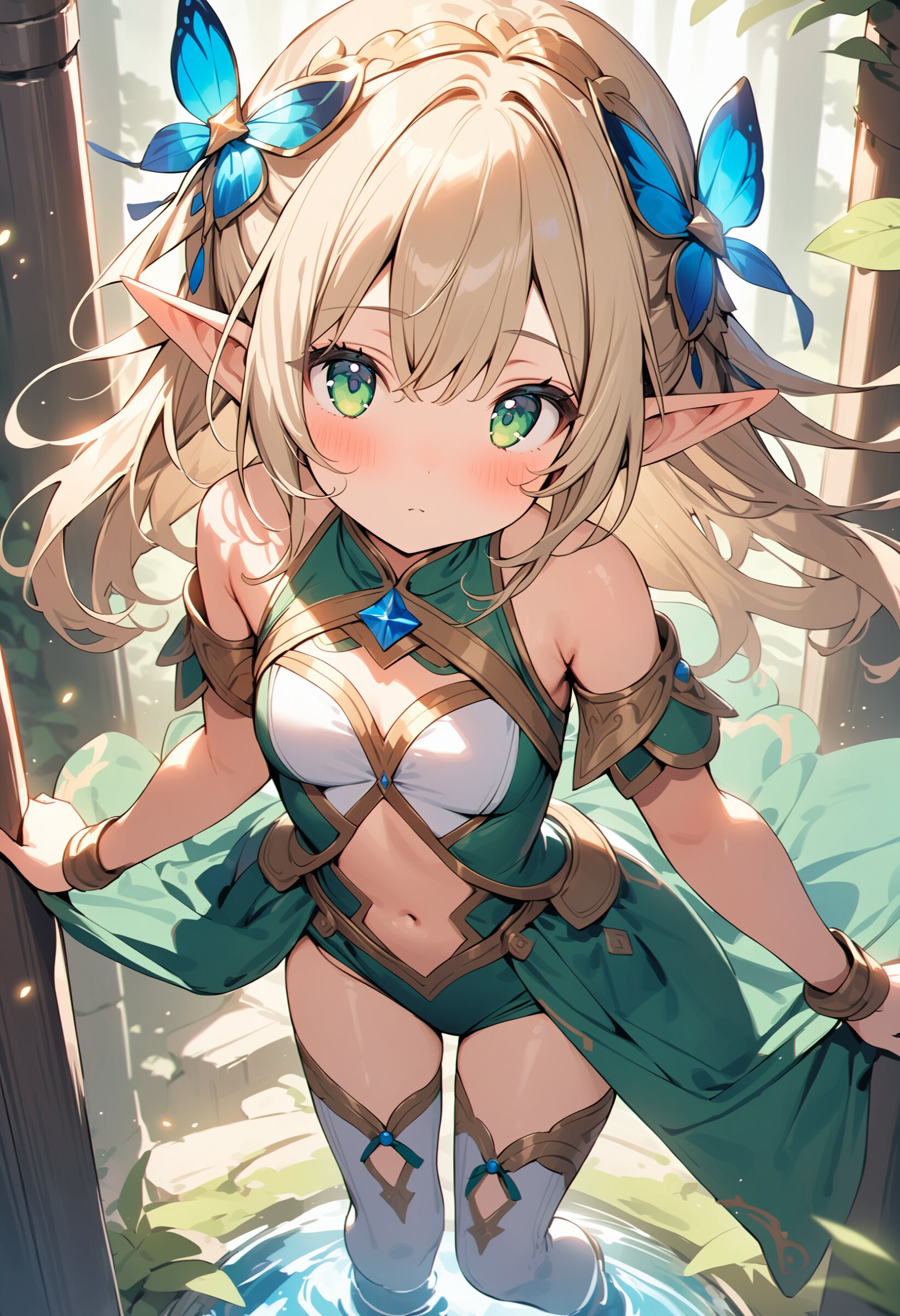 ((masterpiece)), ((best quality)), ((kawaii)), cute, (lovely), ((extremely detailed)), (beautiful), dynamic angle, sacred place, a cute girl, 1girl, solo, ((elf )),beautiful blond hair, beautiful green eyes, ((beautiful eyes)), long hair, fantasy clothes,