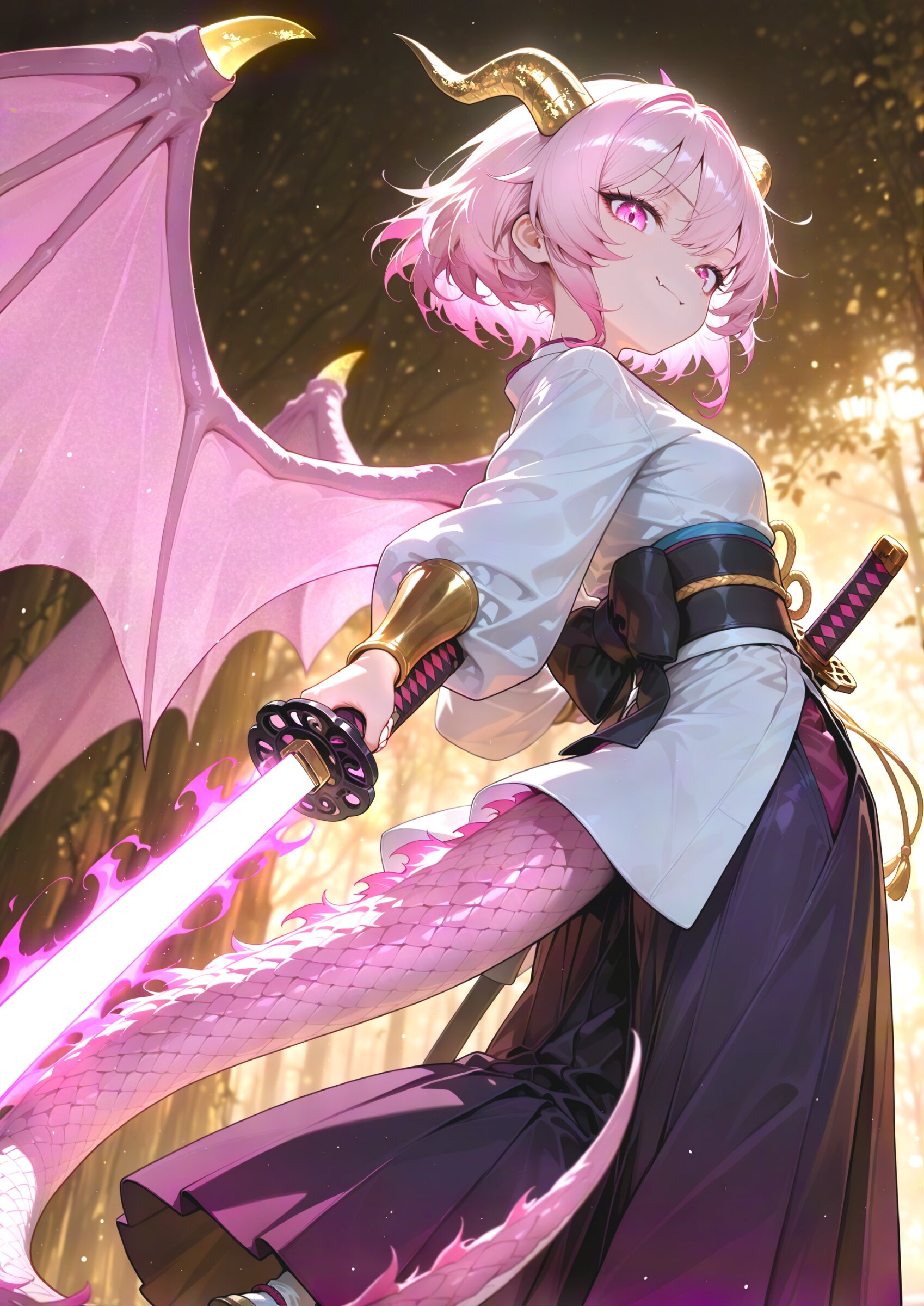 super fine concept art, hard surface, 8K, masterpiece, best quality, amazing quality, very aesthetic, absurdres, Over the Shoulder Shot, looking back, (cowboy shot:1.15) from below, looking down , (dutch angle:1.2), autumn atmosphere. earthy color theme, (simple paper background:1.0), sumi-e, faux traditional media, color ink \(medium\), painting \(medium\), calligraphy brush (medium), , spot color, 1dragon girl, solo, , Over the Shoulder Shot, looking back, (from below:1.0), looking at viewer, dragon girl, 15yo, (2dragon gold horns attached to the head:1.2), (light pink hair:1.3), (doyagao:1.3), (wavy short hair:1.3), (beautiful pink eyes:1.3), cute, (muscle,buff well-built body,ultra-detailed muscle:0.4) , first-rate female body, perfect body, small breasts smart hips, a dragon tail (2long pink dragon wings on back:1.2), bracer, dark purple hakama,(overskirt:1.0) White Japanese Clothes , (White long sleeve:1.0), blue and white stripe obi, inner, straw sandals, tabi, fighting smile, smug, (doyagao:1.3), mesugaki smile, glowing japanese short sword, (japanese sword action:1.0), glowing sword katana katana swing out glint, (swirling pink energy,energy magic,energy:1.2), glowing eastern dragon pink aura, The background is a solid, bright pink, creating a striking contrast with the intricate, multi-colored design of the character, (fighting silhouette:0.0), pop color background, (high saturation:1.2), autumn coloring, partly black ink wash effect, professional art lots of details, , overexposure, sumie effect style, 4ur4_illu,shiny, glowing, glowing particles, glowing light particles, light particles, vines, <lora:noline (1):-0.5> <lora:sdxl2-flat2-512b:0.0> <lora:facelightup_xl_v10:0.5> <lora:V2_yakumo_alchemy:0.5> <lora:Aura_illu:0.1>