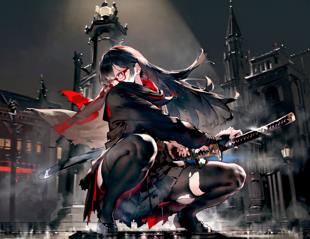 (8k, ultra high res, best quality, masterpiece:1.2), ((train station,night,))((torn clothes,))glasses,1girl,(black sailor uniform,red line in the skirt,)beige cardigan,red scarf,(black pantyhose,)((crowd,)) perfect face,black hime cut,red colored inner hair:1.3,surrounded by police,searchlight,from below:1.2,front view,fog,sweat, (squatting:1.1,spread legs:1.6,kneeing left:1.4,forward leaning posture:1.3,)1sheath:1.4,magic circle at the feet:1.4, 1katana,(((battoujutsu,)))<lora:battoujutsu_24re_d128:1> <lora:Haya:1>