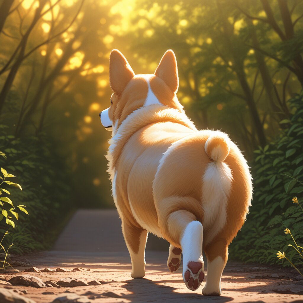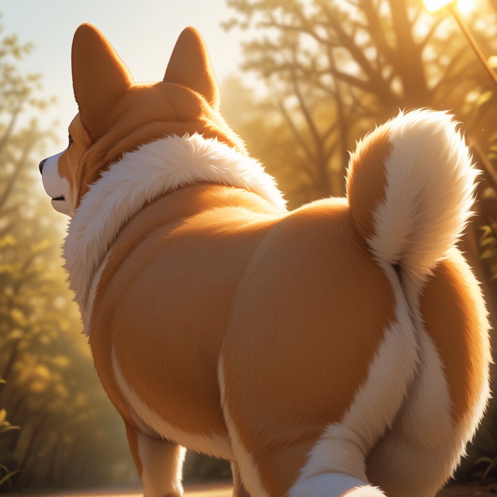 Realistic corgi portrait, back shot, walking, low angle, fluffy fur texture, warm lighting, soft depth of field, natural background, high-quality illustration. (masterpiece, best quality, ultra-detailed, intricate details, anime style, 8k illustration),