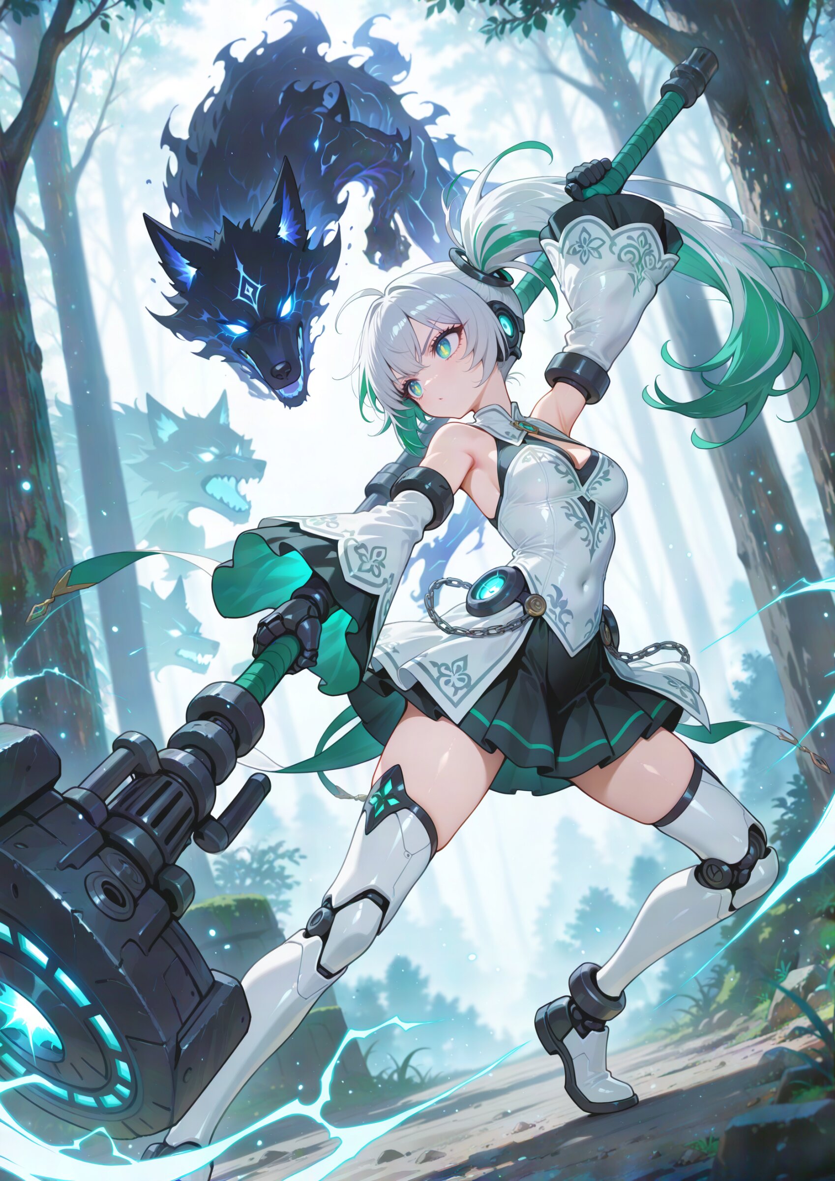 1girl, huge cool sledgehammer in hands, holding huge cool weapon mechanism, machine, foreshortening, dynamic angle (25 years old:1.0), (medium breasts:1.2), (two-tone hair, grey and ever green hair, shoulder length hair, high side ponytail medium bangs:1.0), (beautiful face:1.1), (clear white small eyes:1.0), green pupils , kung fu attack, kung fu pose, kung fu action, outstretched arm, arm up , (mechanical black hands:1.0), black robot ears, , (mechanical white legs:1.1), white mechanical thighs, neon trim, medieval times fantasy world, (cybernetic gynoid:1.0), (mech suit:1.0), (white gothic cuirass:1.0), (robot joints:1.0), (white gorgeous modest wizard's dress skirt:1.1), , glossy silver body with metallic luster cyborg, bare shoulders, (Decorative embroidery:1.0), (white gorgeous dress:1.1), (overskirt:1.0), (white sleeve:1.2), electrokinesis, (battle:1.2), (looking away:1.0), from side, turning head (middle warm colored light purple silhouette of wolf,serious monster silhouette:1.2), In the vast forests of a Western fantasy world, an ancient dungeon lies hidden. Its entrance is a natural arch at the base of a giant tree, with moss-covered stones that speak of its age. The interior is a dense forest where minimal light reaches and the calls of various creatures echo. At the center, an ancient altar is said to be imbued with strong natural magic. This dungeon presents a trial that blends with nature, requiring adventurers to harness nature's power., blurry background, fighting, duel, incoming attack super fine concept art, hard surface, 8K, masterpiece, best quality, amazing quality, very aesthetic, absurdres, professional art lots of details, , overexposure, shiny-glistening, (watercolor style:0.0), (pastel color style:0.5) 4ur4_illu,shiny, glowing, glowing particles, glowing light particles, light particles, <lora:noline (1):1.0> <lora:sdxl2-flat2-512b:0.2> <lora:facelightup_xl_v10:0.5> <lora:V2_yakumo_alchemy:0.5> <lora:Aura_illu:0.1>