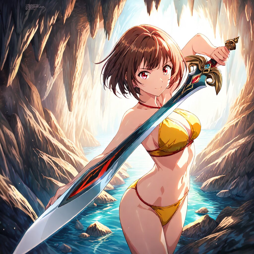((masterpiece)), ((best quality)), (ultra-detailed), anime style,cowboy shot, cave,water, a cute girl, 1girl, solo,Large bust, yellow bikini, beautiful brown hair, beautiful red eyes, ((beautiful eyes)), ((short hair)), Holding a weapon in hand, gripping Sword