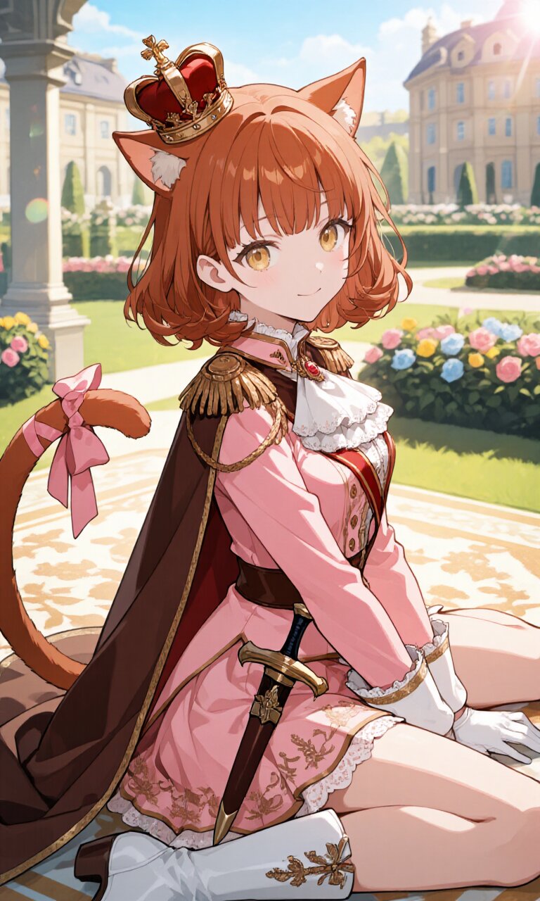 A **1girl** with **light brown short bob wavy hair** and a soft **fringe** gazes at the viewer with **big, beautiful light gold (droopy eyes)**, exuding charm and intelligence. Her **cat ears** and **cat tail with a pink ribbon** enhance her playful yet elegant appearance. She wears a **(Pink luxurious Prince costume:1.5)** with intricate embroidery, layered under a **(Chocolate Brown luxurious Cape:1.3)** that drapes gracefully. The outfit includes a **(luxurious mini skirt:1.3)**, an ornate **(lace jabot:1.2)**, and **(White luxurious gloves:1.2)** with delicate frills. A **(dagger on waist:1.3)** and a **(luxurious crown:1.3)** signify nobility, while **(White luxurious Boots:1.3)** complete the regal attire. She sits on a **luxurious square carpet** in a **palace garden**, surrounded by **rococo architecture** and blooming flowers **(in the flower garden:1.5)**. The afternoon **sunlight** bathes the scene in a warm glow, with **lens flare** and **soft lighting** enhancing the romantic, **classic academia** atmosphere. Her **sparkling smile** and poised posture radiate happiness, while **detailed skin, hair, and clothing textures** showcase **masterpiece-quality** rendering. The composition strongly emphasizes her **face and upper body (full body, strong focus on face and upper body:1.3)**.