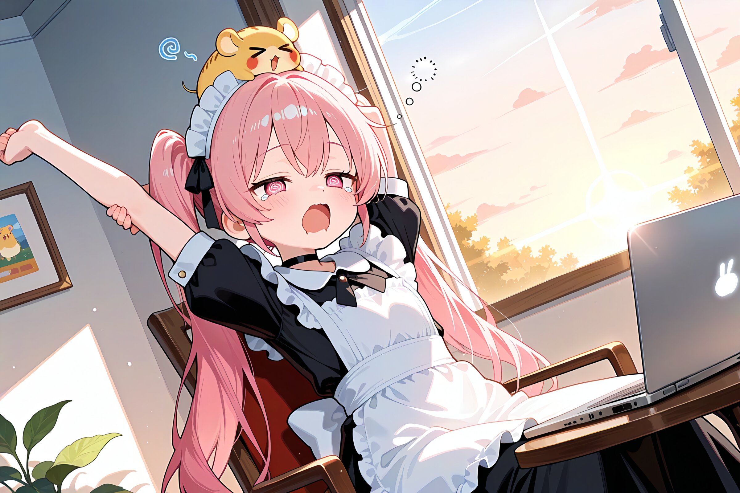 1 little girl, solo, diagonal angle, masterpiece, best quality, amazing quality, very aesthetic, pink hair, twintails, pink eyes, =_=, @_@, sleepy, tearful, squeans, spoken squeans, yawning, stretching, choker, maid outfit, long skirt, hamsters on head, > <, sitting on chair, laptop, morning, sunshine,