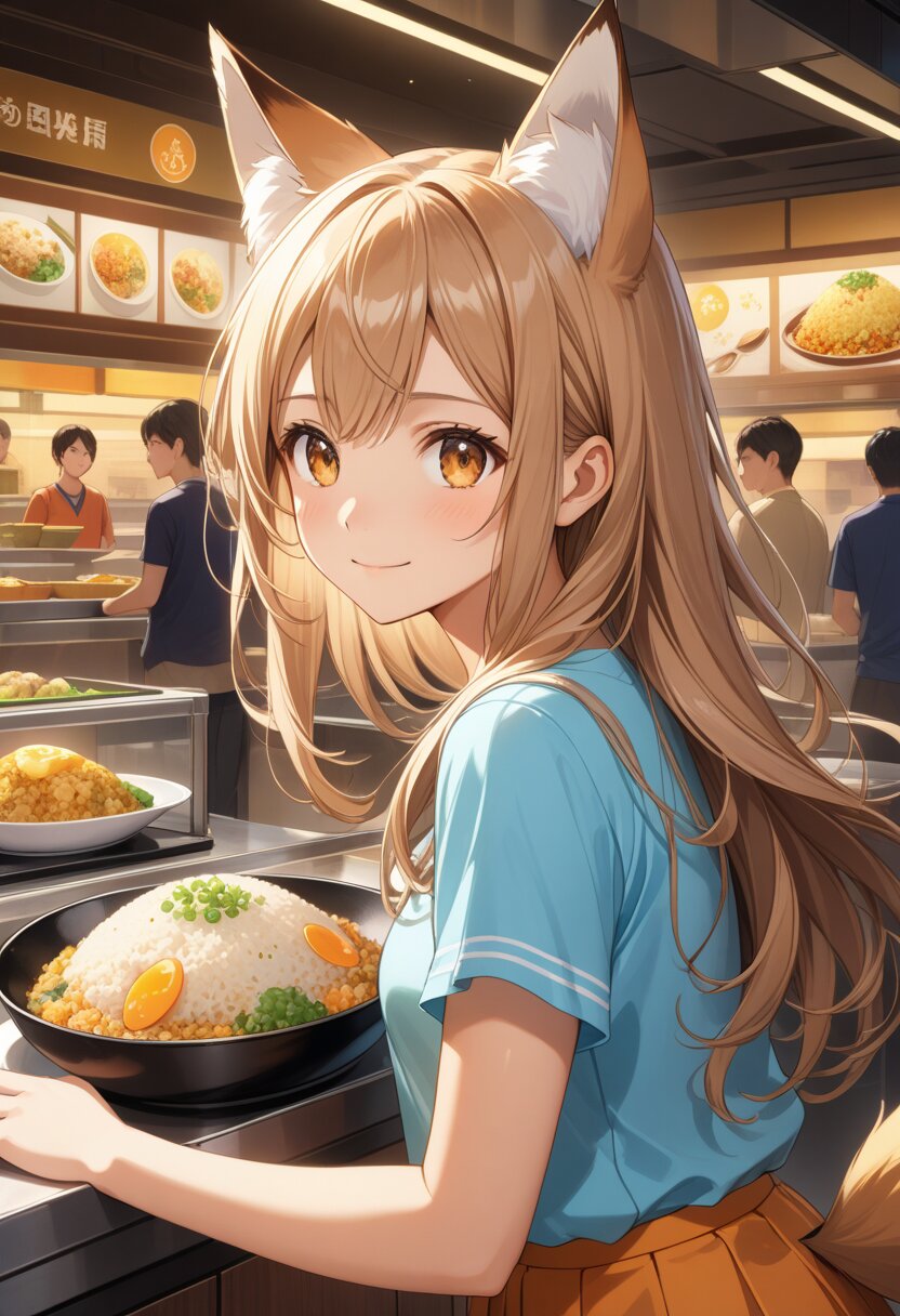 (high resolusion,illustration,ultra detailed 8k art,extremely detailed CG,official art,clothes reflecting light,detailed shiny skin,detailed background:1.3), ((highly detailed beautiful face and eyes),anime_style, fox_girl, fox_ears, light_brown_hair, double_eyelids, long_eyelashes, fluffy_tail, mini_skirt, tights, fried_rice, food_court, casual_pose, cheerful_expression, warm_color_palette, soft_lighting, lively_atmosphere, detailed_background, expressive_eyes, delicate_features, everyday_scene