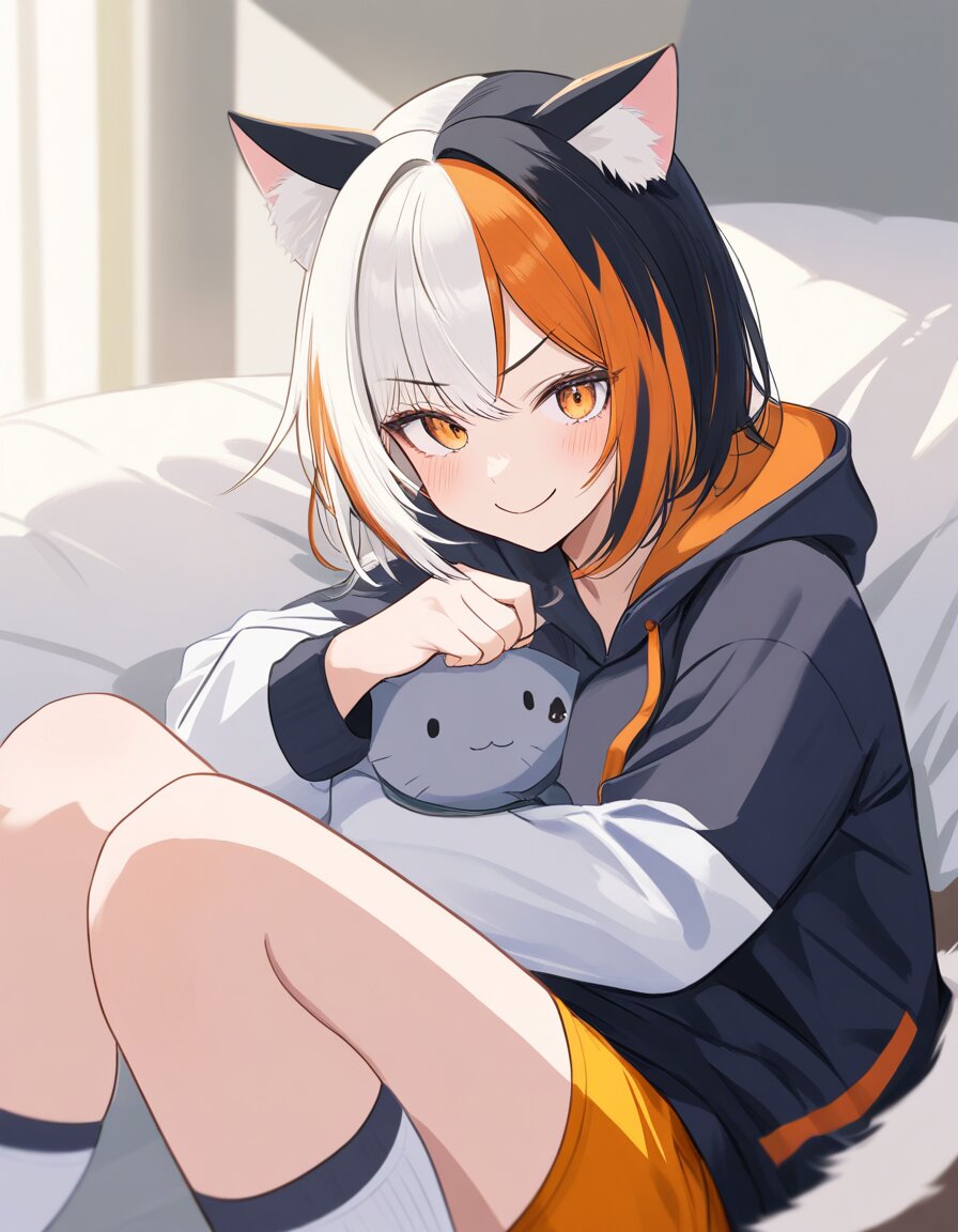 ((masterpiece)), ((best quality)), ((ultra-detailed)), (illustration), (cat girl), calico cat, tricolor hair, (black hair, orange hair, white hair), cat ears, fluffy tail, (mischievous smile), (confident expression), (playful pose), (slightly pouting), (arms crossed), (sporty casual wear), (hoodie), (short pants), (knee high socks), (frills on skirt:0.7), (ribbon on hair:0.6), absurdres