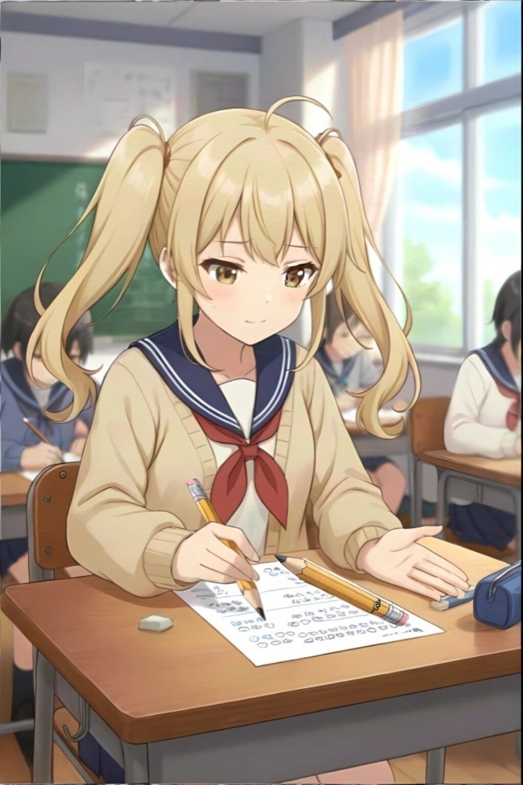 Anime style, cute high school girl with blonde twin tails, wearing uniform and beige cardigan, sitting at desk in classroom taking test, holding pencil, rolling pencil with number on it over test paper, looking down slightly at answer sheet, blue pencil case on desk, other students in background, bright lighting from window, school building, sunny sky, detailed, high quality, vibrant colors