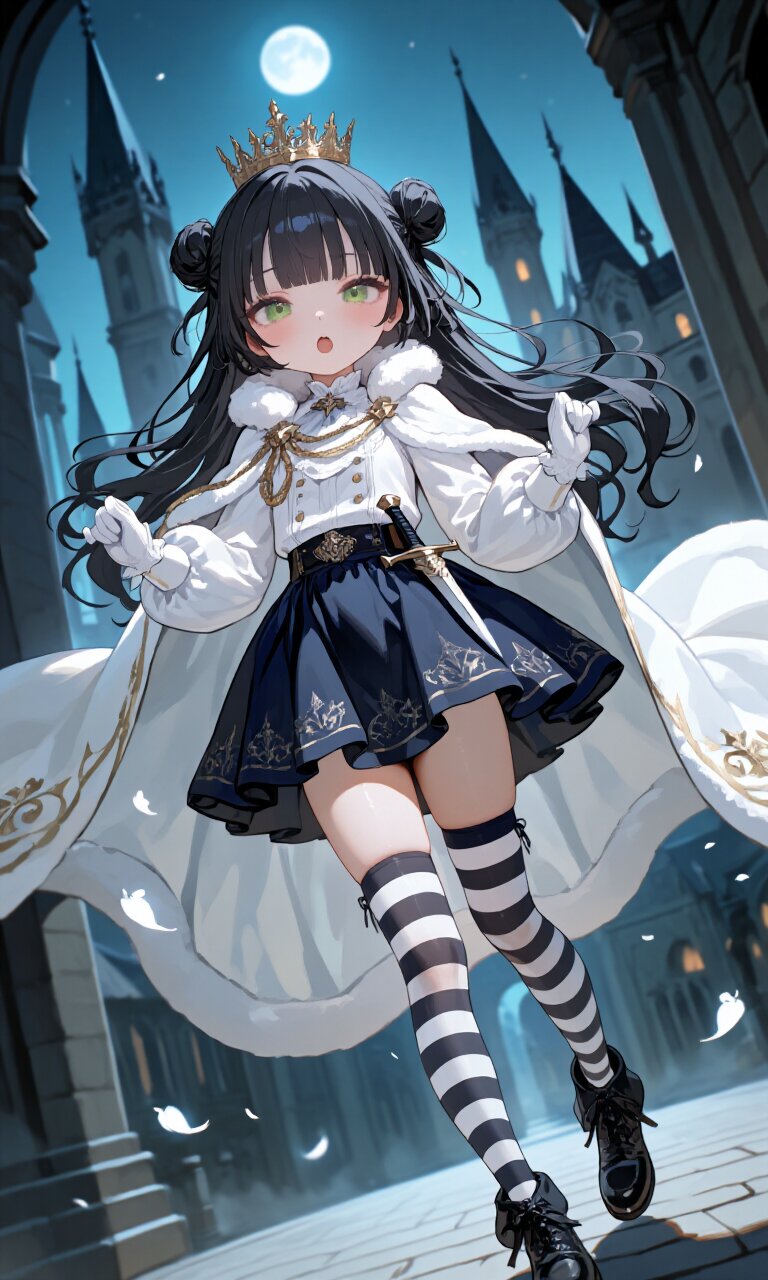 1girl, a 10-year-old girl with a (low height:1.2) and a childish yet refined appearance stands confidently in a moonlit palace courtyard. She has long, flowing black hair styled in twin buns with blunt bangs framing her delicate face. Her large, droopy green eyes sparkle with innocence and happiness, her expression slightly surprised (:O) yet joyful. She wears a (White Prince costume:1.6) with intricate embroidery, long sleeves, and a (White luxurious Cape:1.3) that billows elegantly behind her. A (luxurious Navy mini skirt:1.4) flows gracefully over her (petite hip:1.2), paired with (striped thighhighs) that accentuate her (thin thighs:1.2). On her feet are (Black luxurious shoes:1.3), and a (dagger on waist:1.3) adds a touch of regal fierceness. A (luxurious crown:1.4) rests atop her head, and (White gloves:1.2) complete her princely attire. The background features gothic architecture under a starry night sky, bathed in soft moonlight and a hazy, mystical atmosphere. The romantic academia aesthetic enhances the dreamy yet sophisticated setting. The image is rendered with insanely detailed textures—from the delicate strands of her hair to the elaborate folds of her clothes—achieving a masterpiece quality with 16k clarity.
