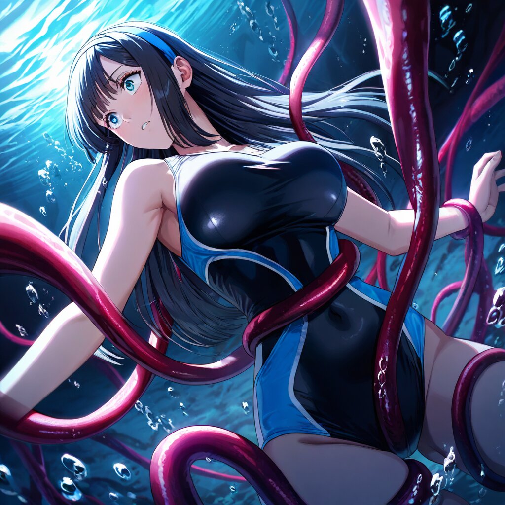 ((masterpiece)), ((best quality)), (ultra-detailed), anime style,cowboy shot, dark cave,underwater, submerged,a cute girl, 1girl, large bust ,Tentacles entangled her body,(Black Racing-style swimsuit), beautiful black hair, ((beautiful eyes)),straight hair, (blunt hair), ((blue hairband)), (drifting underwater),on back,head down,sinking,horrified,screaming,painful face,bloody her body